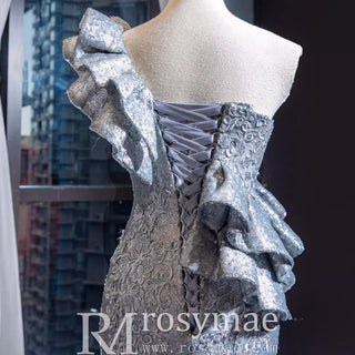 Turn heads in this exquisite haute couture silver mermaid prom dress! The one-shoulder design and intricate lace appliques add a touch of elegance, while the stunning mermaid silhouette and chapel train make for a show-stopping entrance. Handmade with the finest craftsmanship, this dress is perfect for any pageant or formal event.
