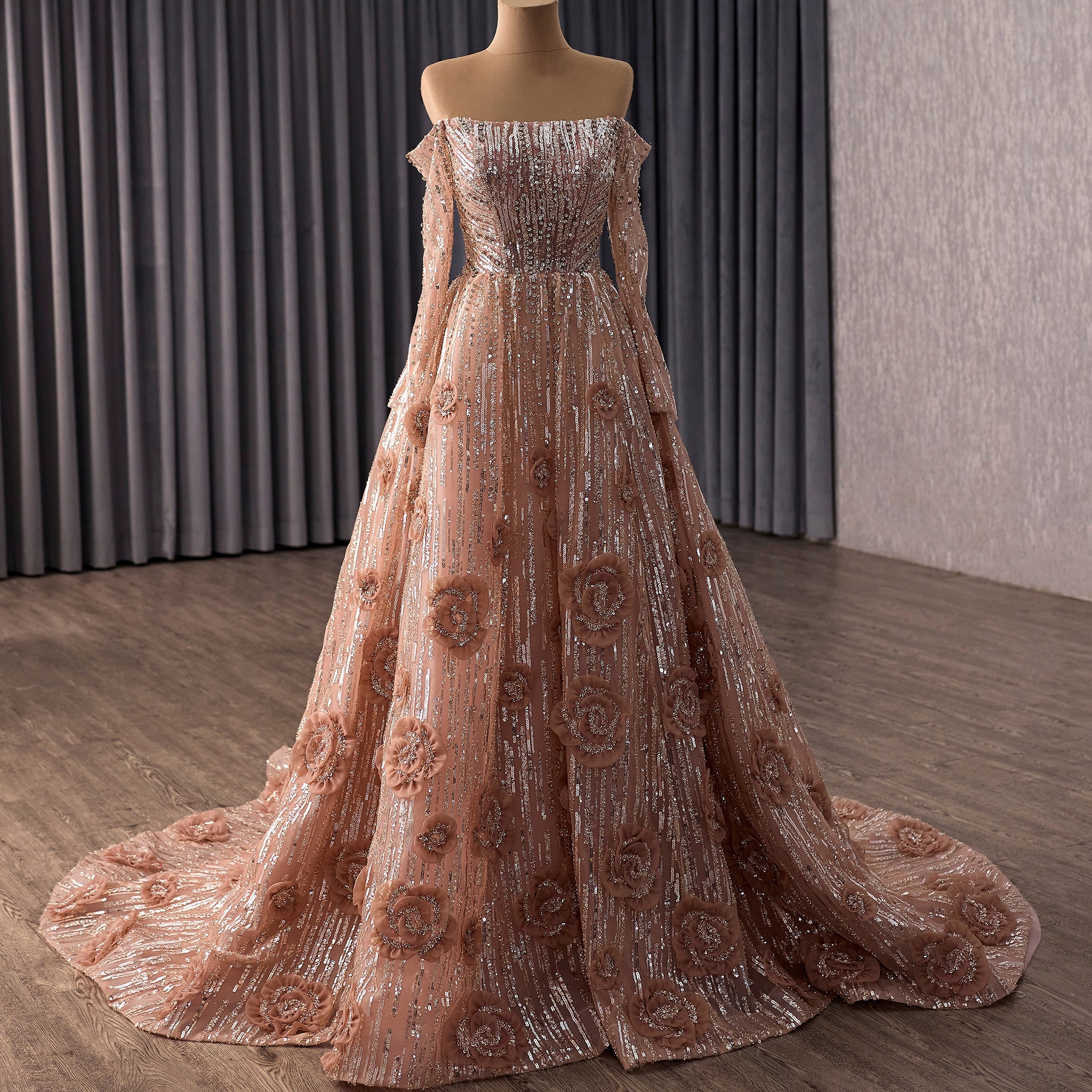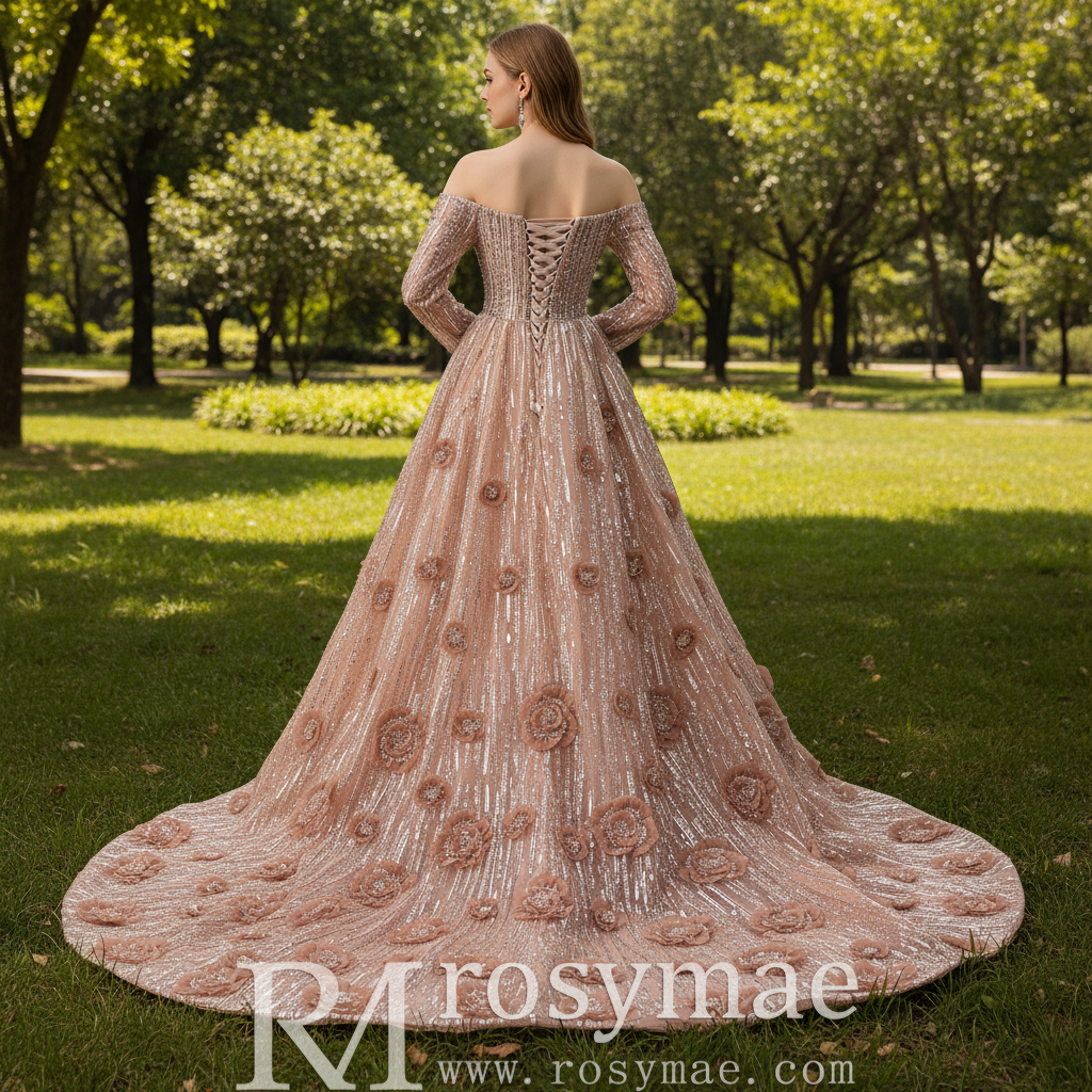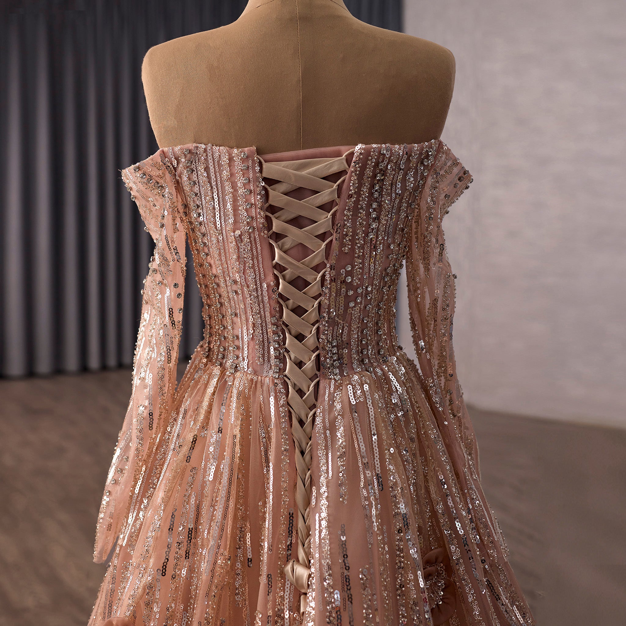 Make a memorable impression in this stunning blushing pink evening gown. Designed with a flattering A-line silhouette, it features delicate off-the-shoulder long sleeves and a backless style for modern elegance. Hand-applied beading, sequins, and appliqués add a touch of sparkle, while the sweep train completes the look with graceful sophistication. Perfect for galas, proms, and formal parties.