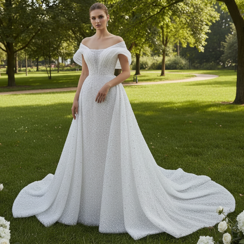 This off-the-shoulder bridal gown is lavishly embellished with intricate crystal and pearl details, creating a look of refined opulence. The neckline features soft, elegant draping that enhances the romantic silhouette, while the structured A-line skirt provides a classic, flattering shape. A detachable overskirt is offering versatility and allowing the gown to transition seamlessly from ceremony to reception.