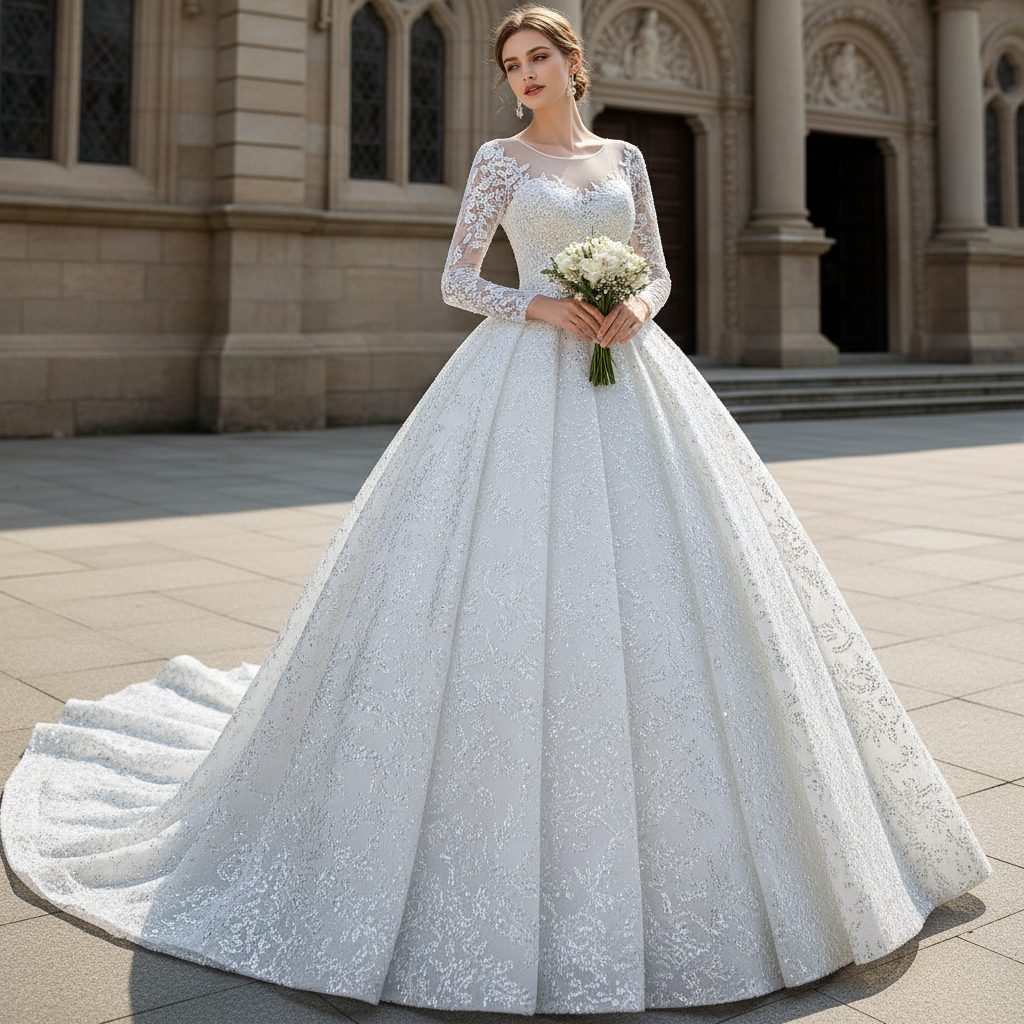Radiate pure elegance in this exquisitely handcrafted ball gown, designed for brides who appreciate timeless luxury and meticulous artistry. Every inch of this stunning bridal gown is adorned with lustrous beading and shimmering sequins, creating a captivating sparkle that catches light from every angle. The modest scoop neckline and full-length sleeves offer graceful coverage while maintaining an air of sophisticated romance, making this dress perfect for traditional ceremonies or vintage-inspired celebrations. The voluminous ball gown silhouette creates a dramatic, princess-like presence, flattering your natural curves while allowing effortless movement throughout your special day. The structured corset back provides exceptional support and a flattering fit, ensuring you feel secure and confident as you celebrate. Intricate beadwork covers the bodice and extends throughout the skirt, showcasing exceptional handmade craftsmanship that sets this gown apart from mass-produced alternatives. The sparkling accents dance beautifully in photographs and candlelight, creating magical moments you'll treasure forever. Whether you envision a grand ballroom celebration, an elegant garden ceremony, or a luxurious destination wedding, this gown delivers the opulence and refinement you deserve. Feel like royalty as you walk down the aisle in a dress that embodies timeless beauty, exceptional quality, and the luxury you've always dreamed of.