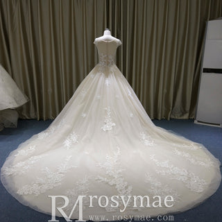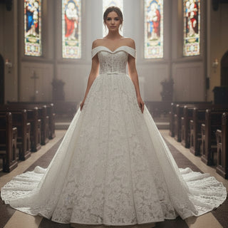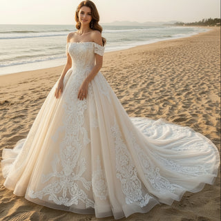 Princess Floral Lace Ball Gown Wedding Dress with Off the Shoulder