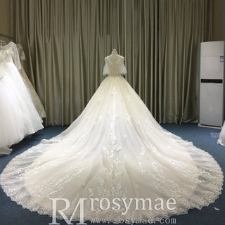 Sparkly Lace Long Sleeves Illusion Boat Neck Ball Gown Wedding Dress