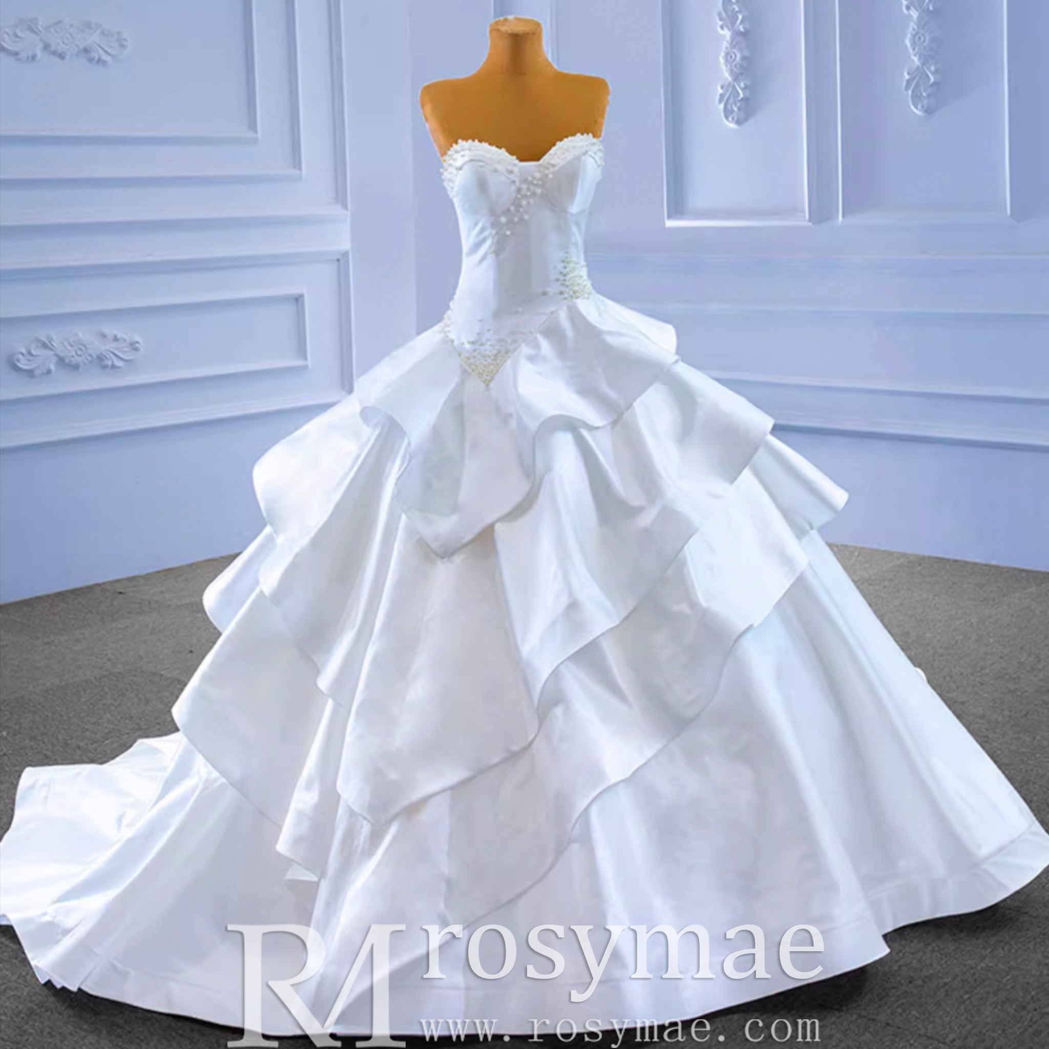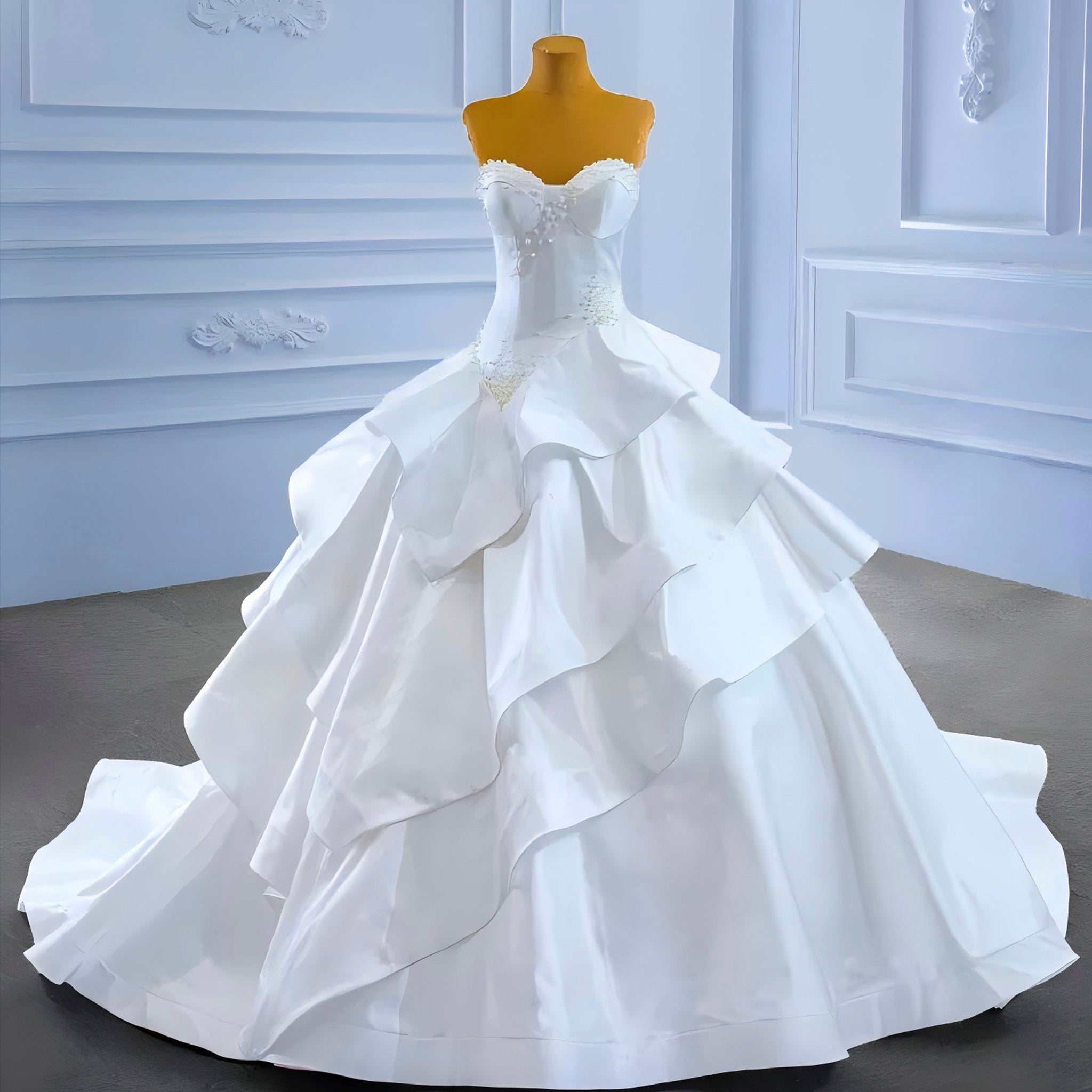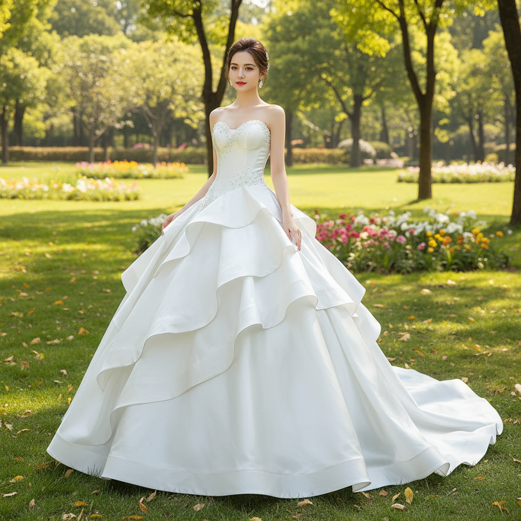 Step into a world of timeless elegance with this exquisite handmade wedding dress, where vintage charm meets modern luxury. The graceful sweetheart neckline beautifully frames your décolletage, while the magnificent tiered ball gown blooms into a voluminous silhouette adorned with delicate ruffle details. Each layer of luxurious satin creates dimension and movement, flowing with poetic grace as you walk down the aisle.