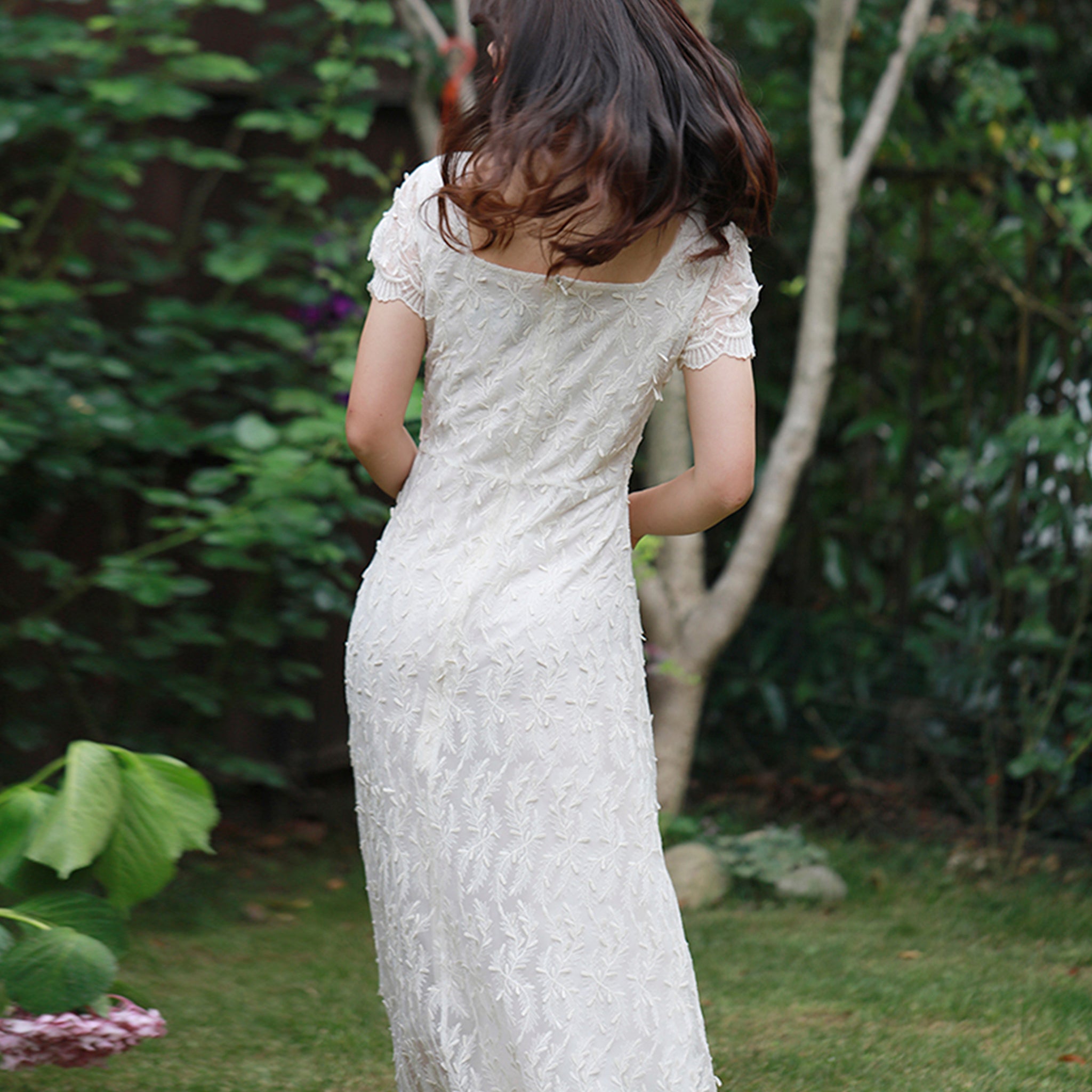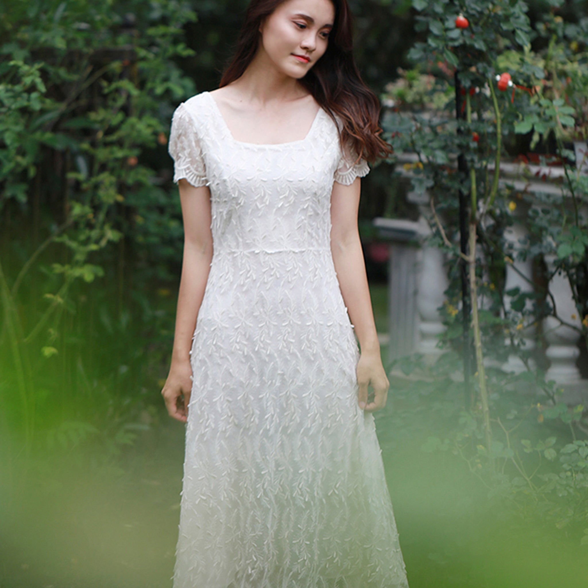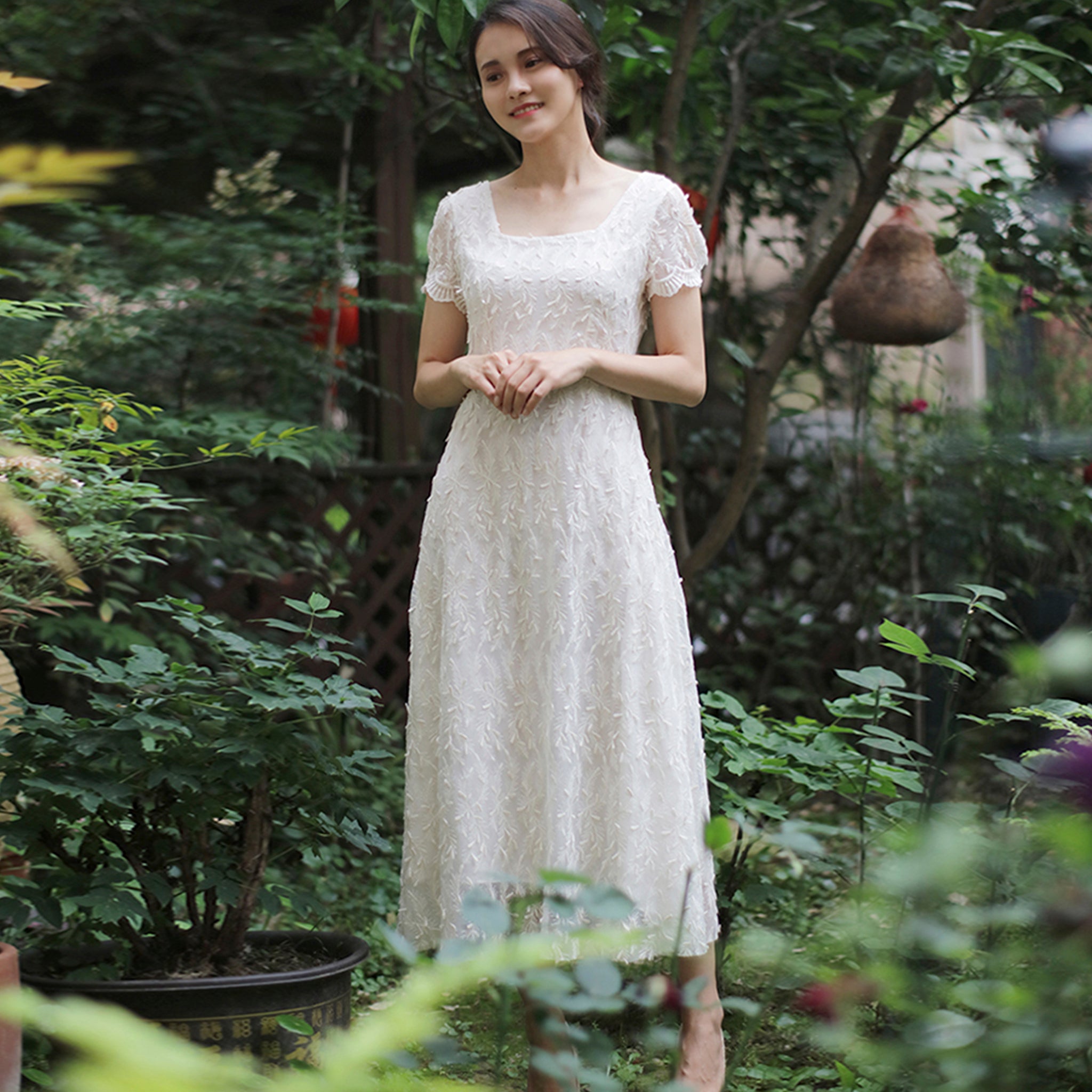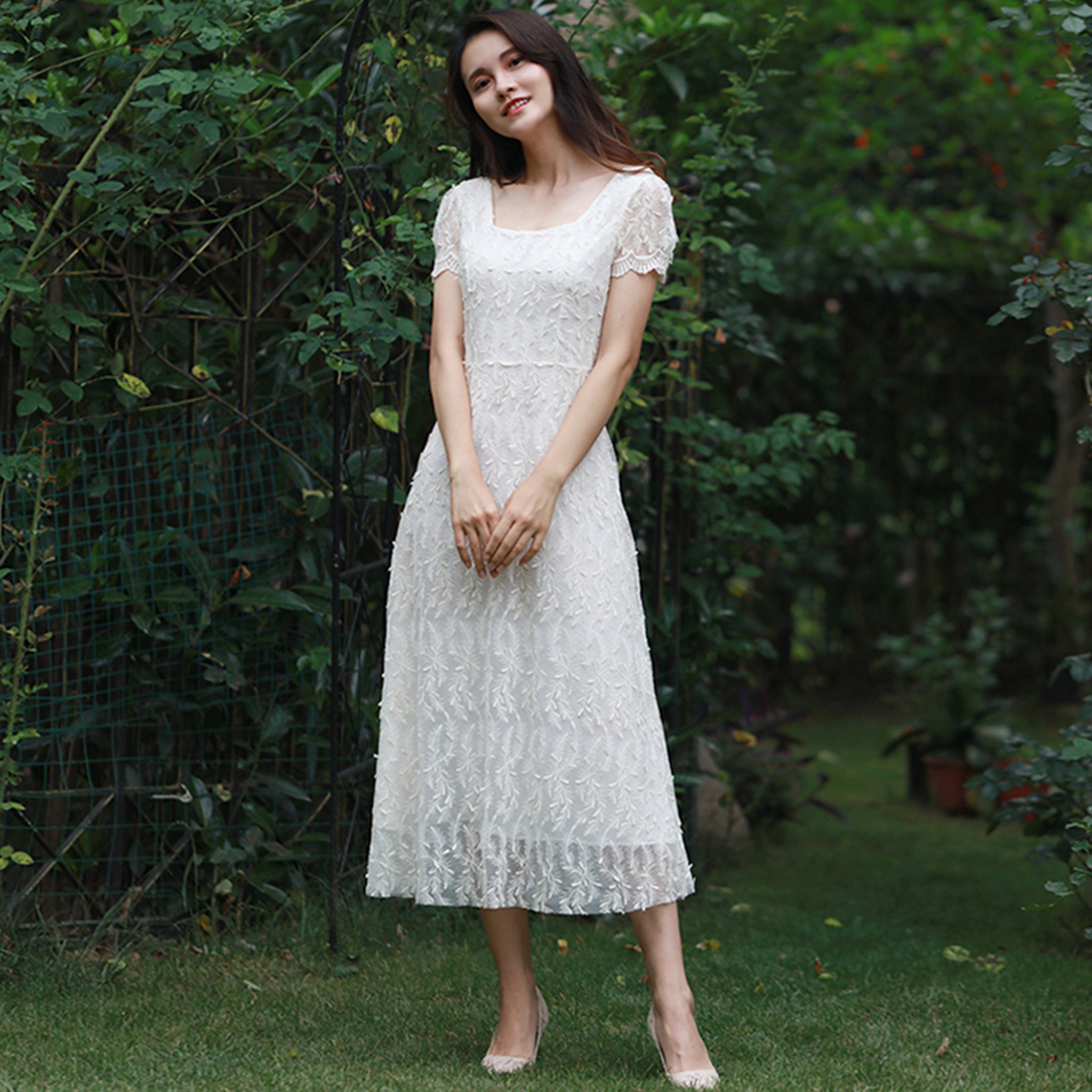 Elegant white lace midi dress combining timeless sophistication with versatile styling. The delicate intricate lace detailing and classic A-line silhouette create a refined tea-length design perfect for weddings, formal events, and upscale casual occasions. Short sleeves provide modest coverage while maintaining an airy, breathable feel ideal for beach settings and warm-weather celebrations. The square neckline adds contemporary charm to this traditional style, making it equally suitable for bridesmaids, garden ceremonies, or special milestone events. A wardrobe essential that transitions seamlessly from formal affairs to relaxed seaside gatherings.