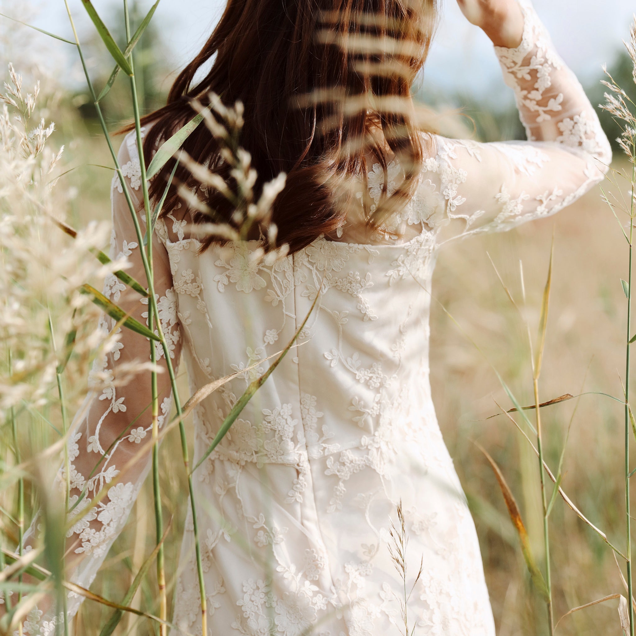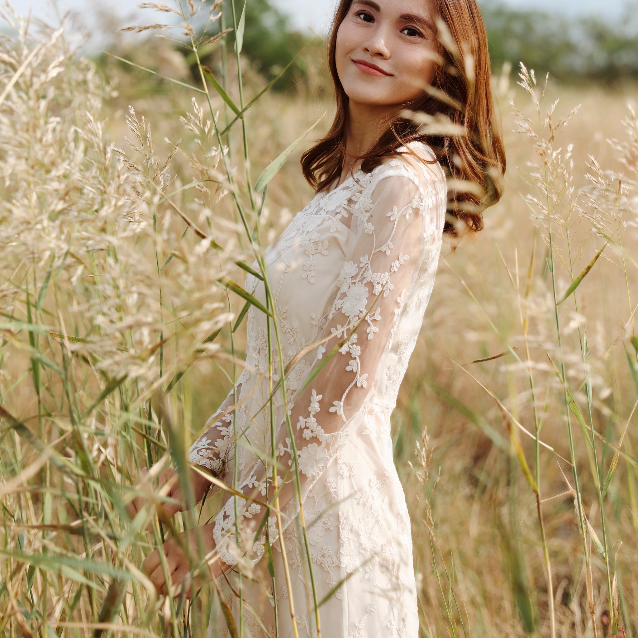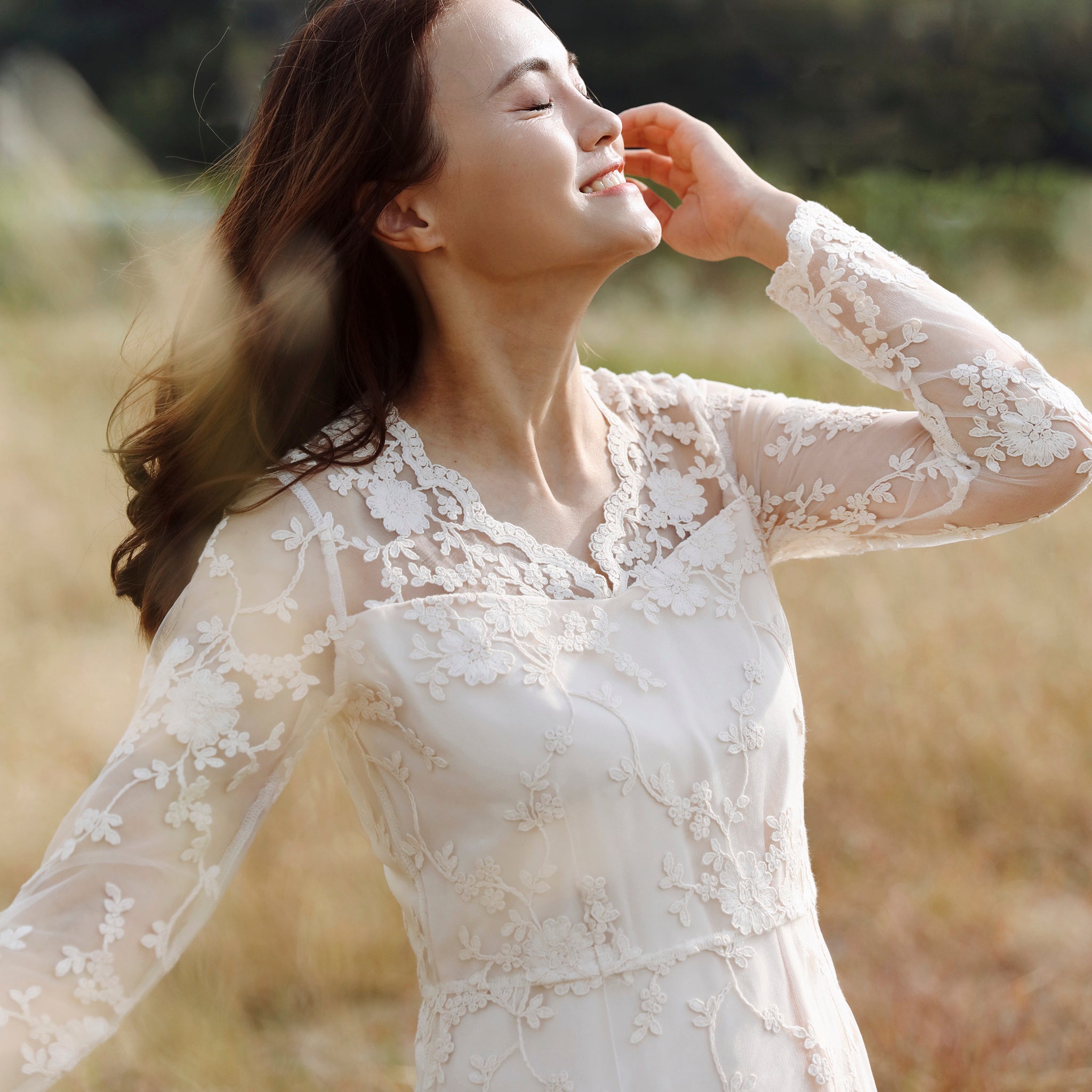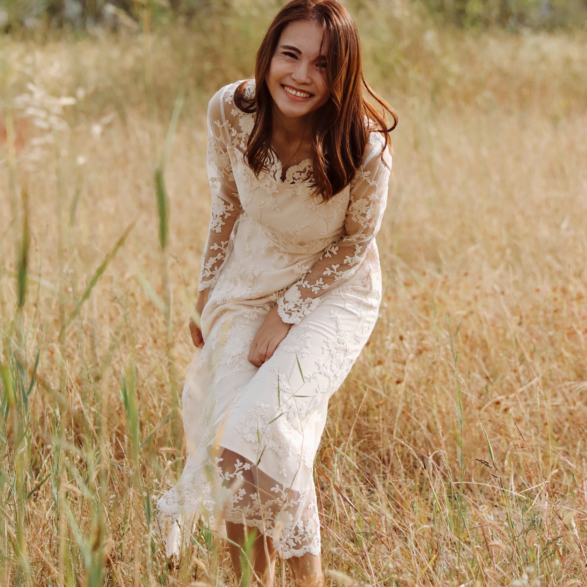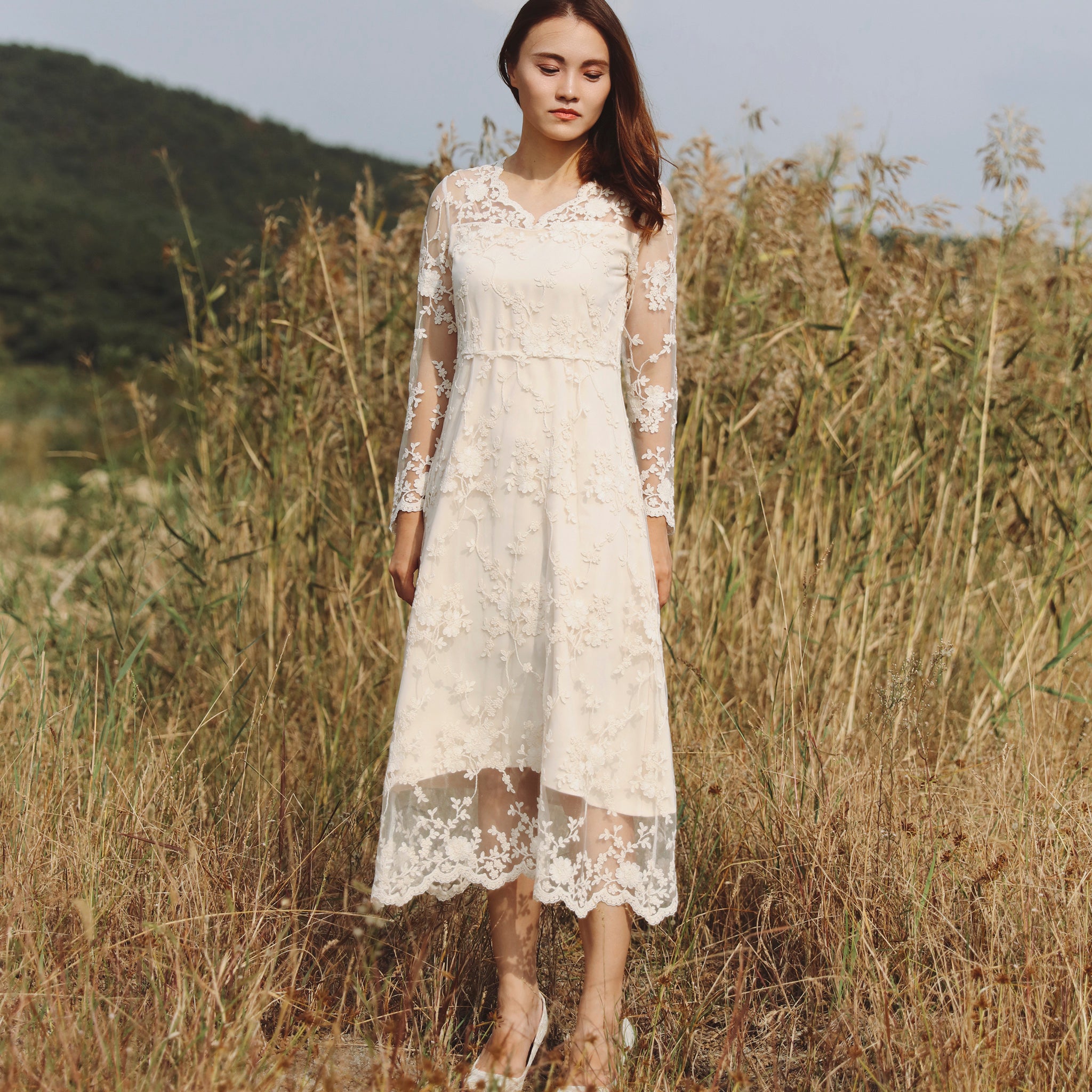 Discover timeless elegance with this bohemian-inspired lace midi dress, crafted for the modern bride seeking understated sophistication. The delicate floral lace overlay creates an ethereal silhouette, while sheer long sleeves and a graceful V-neckline offer refined femininity. Intricate scalloped lace detailing adorns the hem and cuffs, adding vintage-inspired charm. Perfect for weddings, formal celebrations, or special occasions where refined style meets romantic allure. This versatile piece transitions beautifully from ceremony to reception, embodying the effortless grace of bohemian bridal fashion.