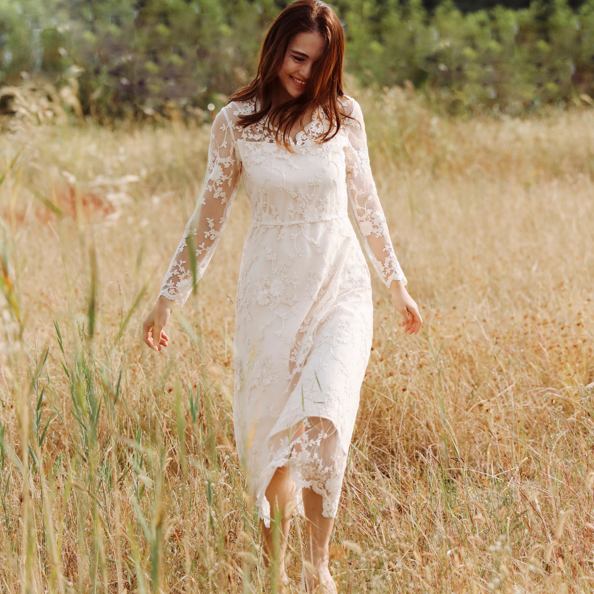 Elegant Bohemian-style Lace Midi Wedding Dress with Long Sleeve