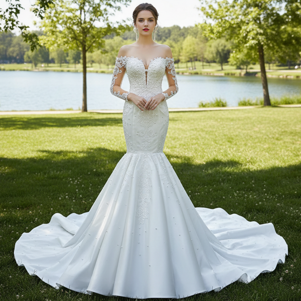 Discover the epitome of bespoke bridal elegance with this exquisite vintage-inspired mermaid wedding dress. Meticulately hand-crafted, the gown showcases intricate lace appliqués that cascade gracefully over the figure-hugging silhouette, creating a timeless and romantic effect. The elegant off-the-shoulder neckline is delicately adorned with lustrous pearl accents, adding a touch of refined sparkle. Designed to flatter your form, the mermaid shape elegantly contours the body before flaring into a subtle, dramatic train. For the fashion-forward bride seeking a statement piece, this dress merges vintage charm with couture sophistication, ensuring you feel radiant and unforgettable as you celebrate your most cherished moments.
