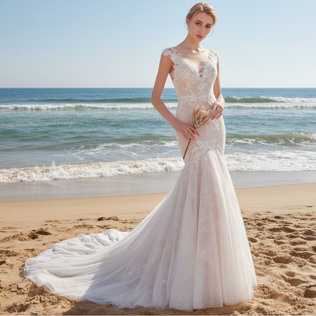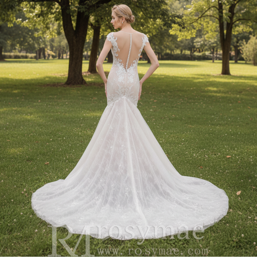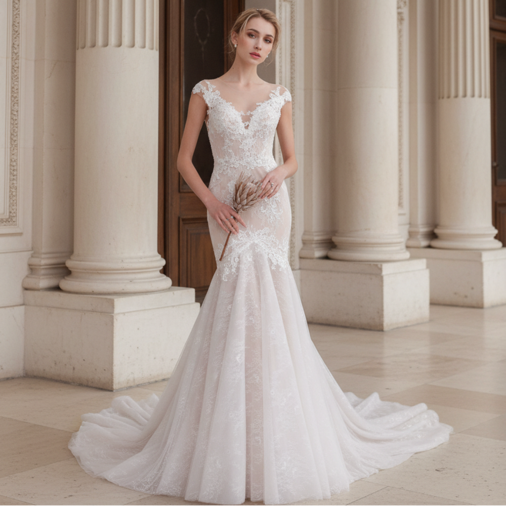 This stunning vintage-inspired mermaid wedding dress combines timeless elegance with sophisticated details. The gown features exquisite lace throughout, adorned with delicate beading that catches light beautifully. The deep plunging sweetheart neckline and capped sleeves create a flattering silhouette, while the low-cut back showcases an ethereal sheer illusion panel for added dimension and grace. A zipper closure trimmed with diamante buttons adds a luxurious finishing touch, ensuring both security and visual appeal. The dramatic court train completes the look with classic bridal drama, making this dress ideal for formal ceremonies and unforgettable moments. Perfect for brides seeking a romantic, vintage-influenced aesthetic with modern construction and refined craftsmanship.