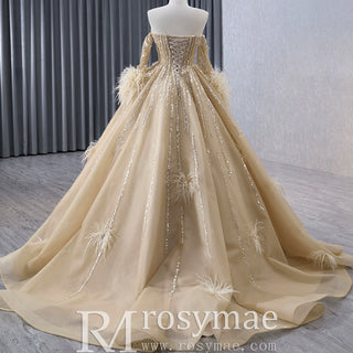 Off the Shoulder Long Sleeve Lace Champagne Wedding Dress with Sleeves