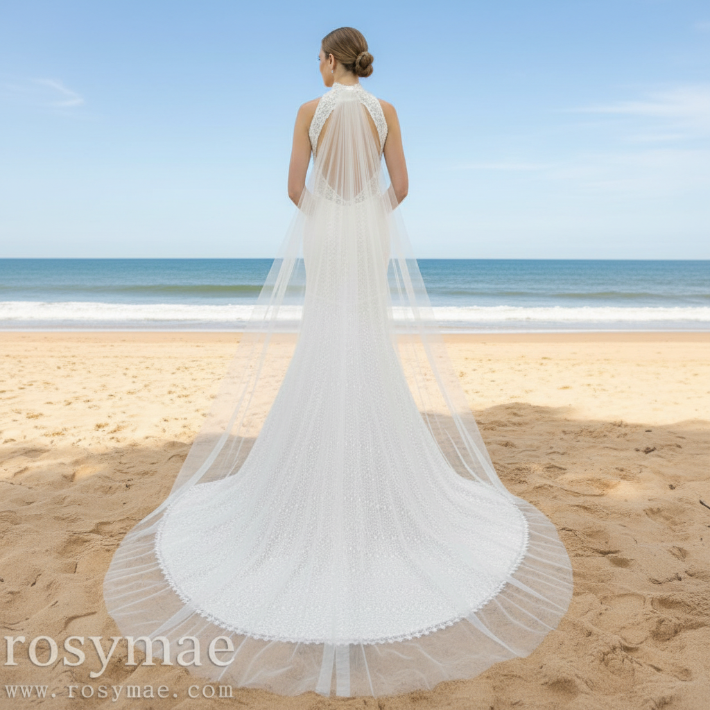 Make a breathtaking statement on your wedding day with this elegant lace mermaid wedding dress, where timeless sophistication meets contemporary flair. The gown is richly adorned with intricate lace that adds refined texture and a luxurious appeal, enhancing your bridal look with classic elegance. Its halter neckline beautifully accentuates your shoulders and neck, creating a flattering frame that exudes poise and style. The daring open back introduces a modern, attractive contrast, infusing the design with a sense of boldness while maintaining graceful charm. The magnificent long cape flows effortlessly from the shoulders, adding a regal dimension that captures attention and elevates your entrance to unforgettable heights. Tailored to perfection, the mermaid silhouette embraces your curves and cascades smoothly to the floor, offering both comfort and fluid movement. Perfect for brides who desire a harmonious blend of vintage attractive and fresh design elements, this exquisite dress promises to make your wedding day extraordinary, leaving a lasting impression of elegance, confidence, and beauty that will be remembered for years to come.