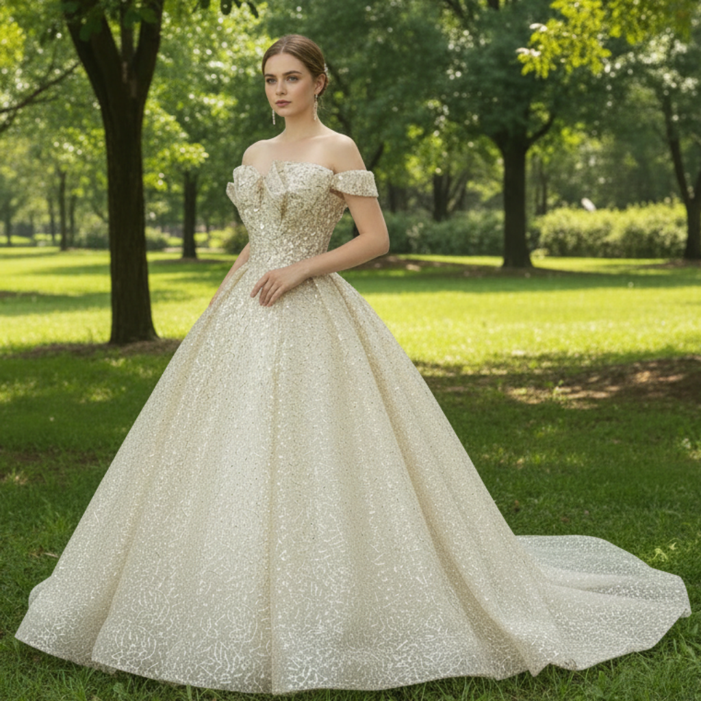 This vintage champagne gold wedding dress showcases a luxurious sparkly fabric that captures and reflects light, adding a subtle yet captivating shimmer to your bridal look. The off-the-shoulder neckline is delicately adorned with romantic ruffle detailing, softly framing the décolletage to create an elegant and feminine appeal. Designed with a flattering empire waist, the dress gently defines the figure while allowing for comfortable movement throughout your celebration. The flowing silhouette is beautifully accentuated by a sweeping cathedral train, lending a dramatic and breathtaking presence as you make your grand entrance. Expertly crafted with meticulous attention to detail, this gown offers an exquisite blend of timeless sophistication, romantic charm, and luxurious refinement—perfect for brides seeking an unforgettable statement of elegance on their special day.