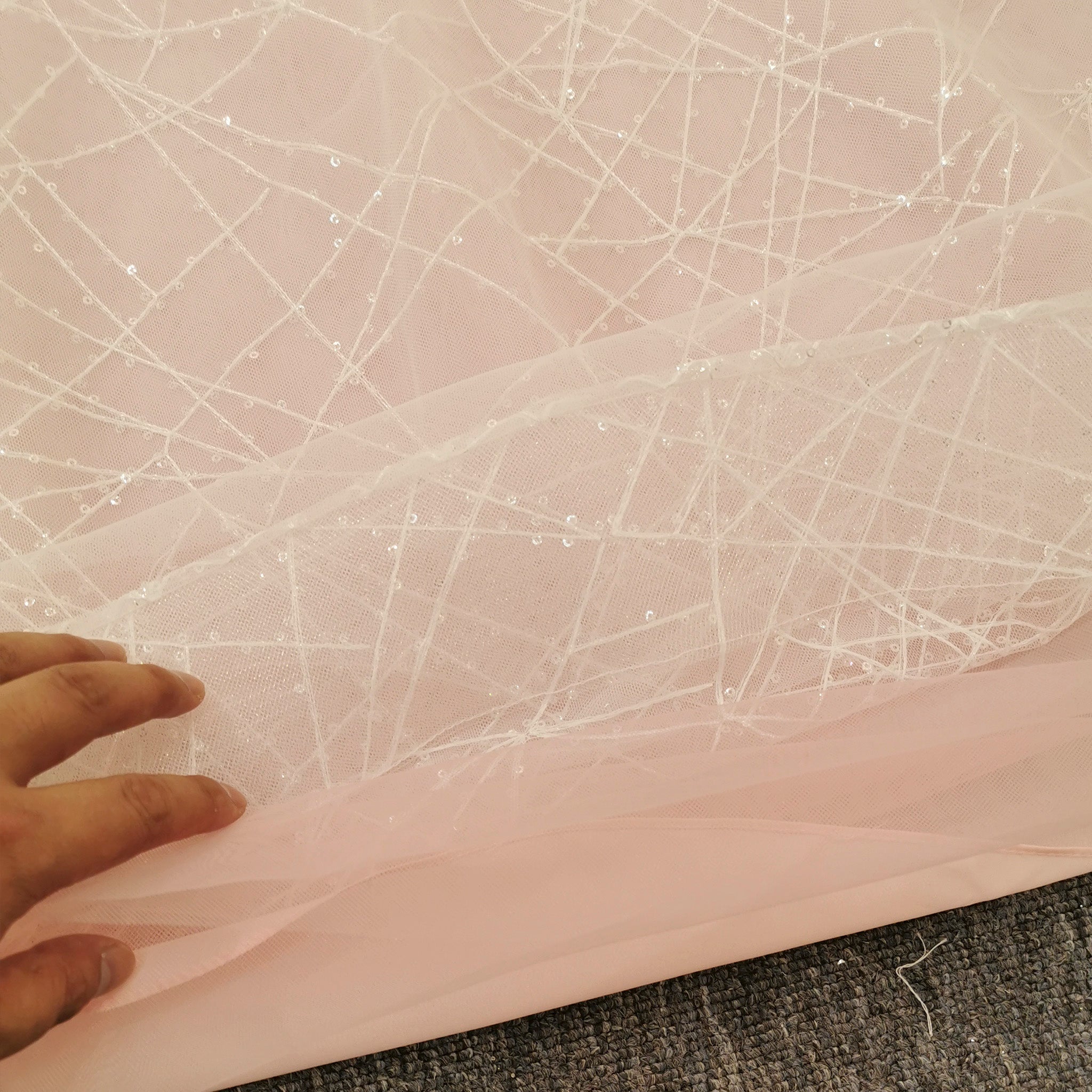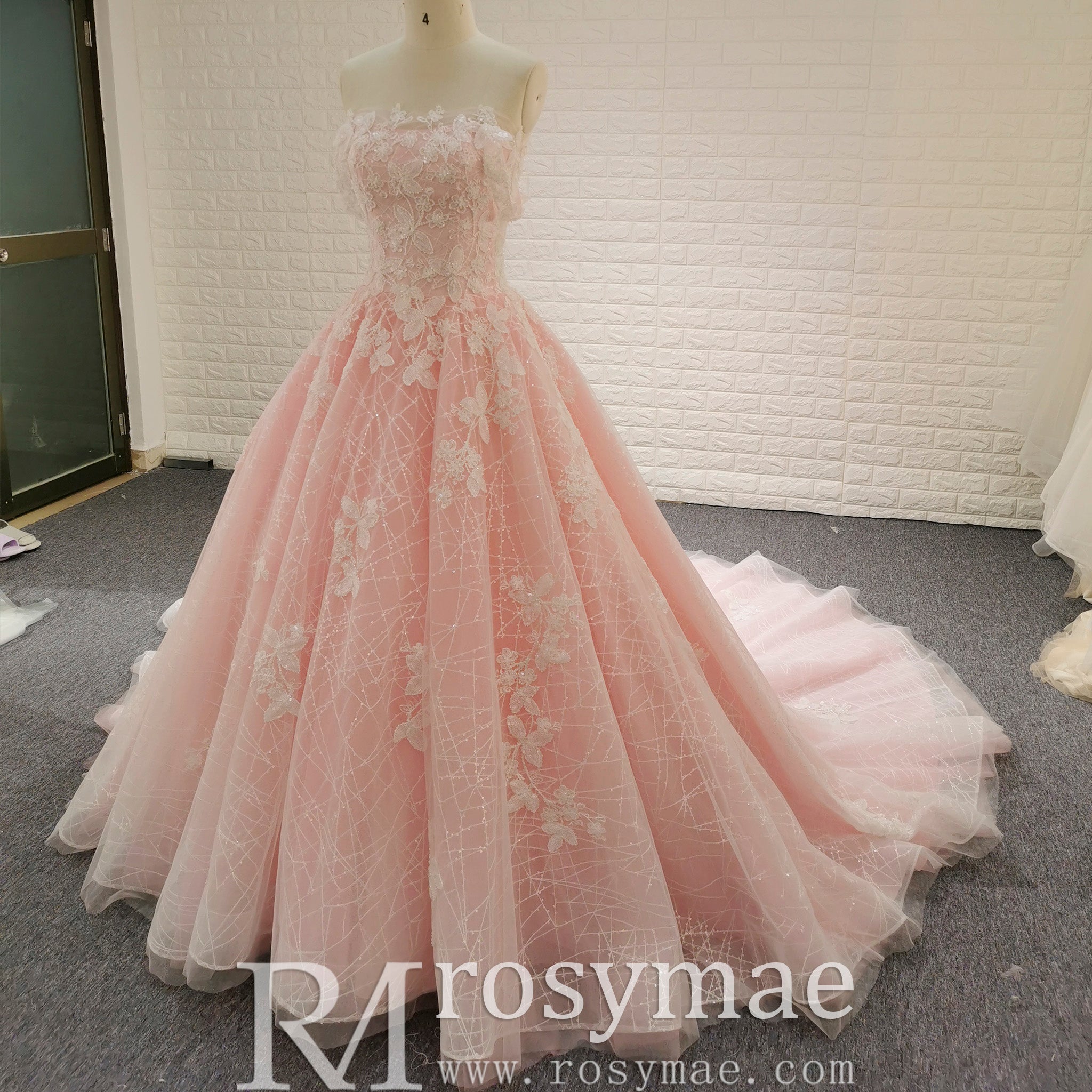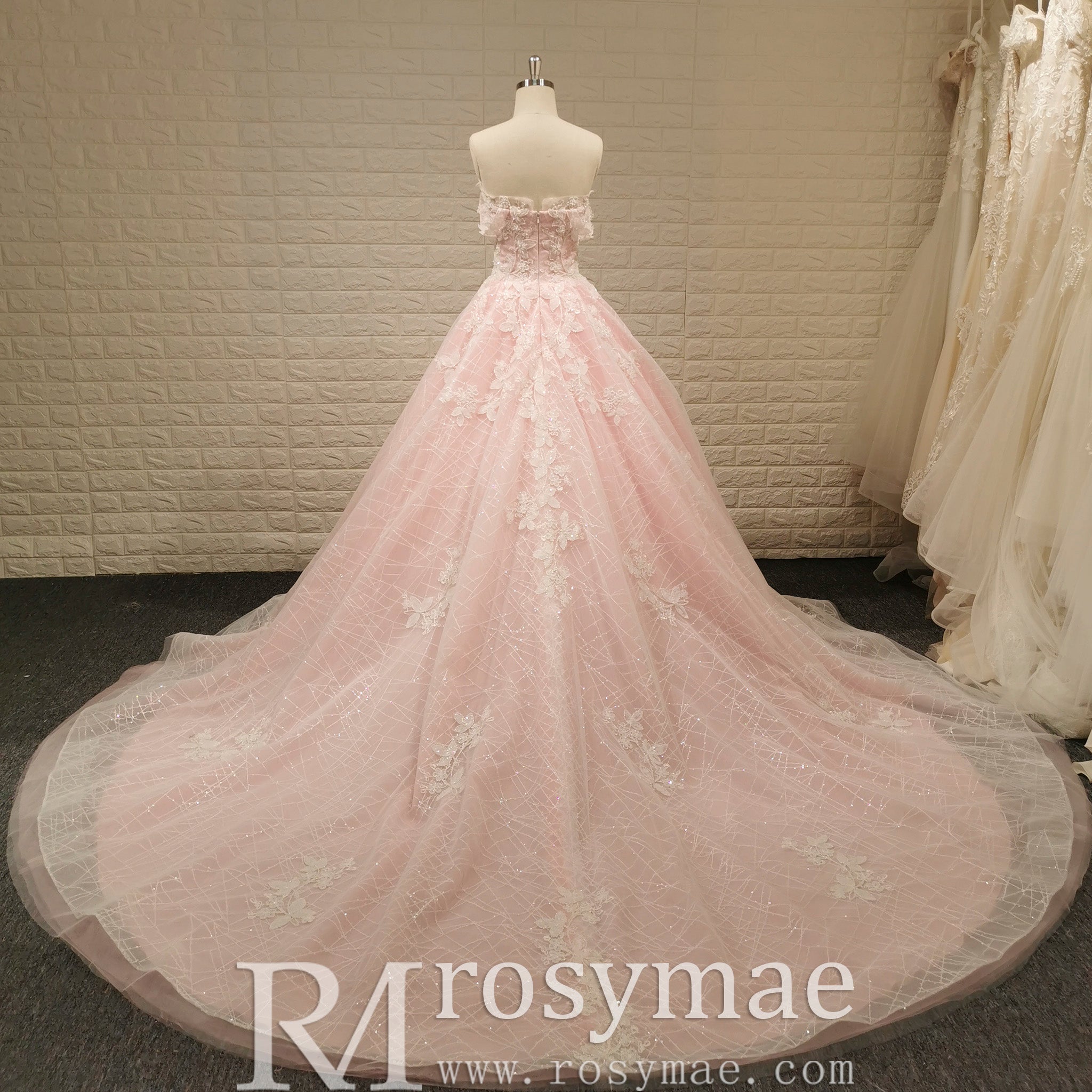 Romantic Off the Shoulder A-line Pink Sparkly Wedding Dress with Floral Lace
