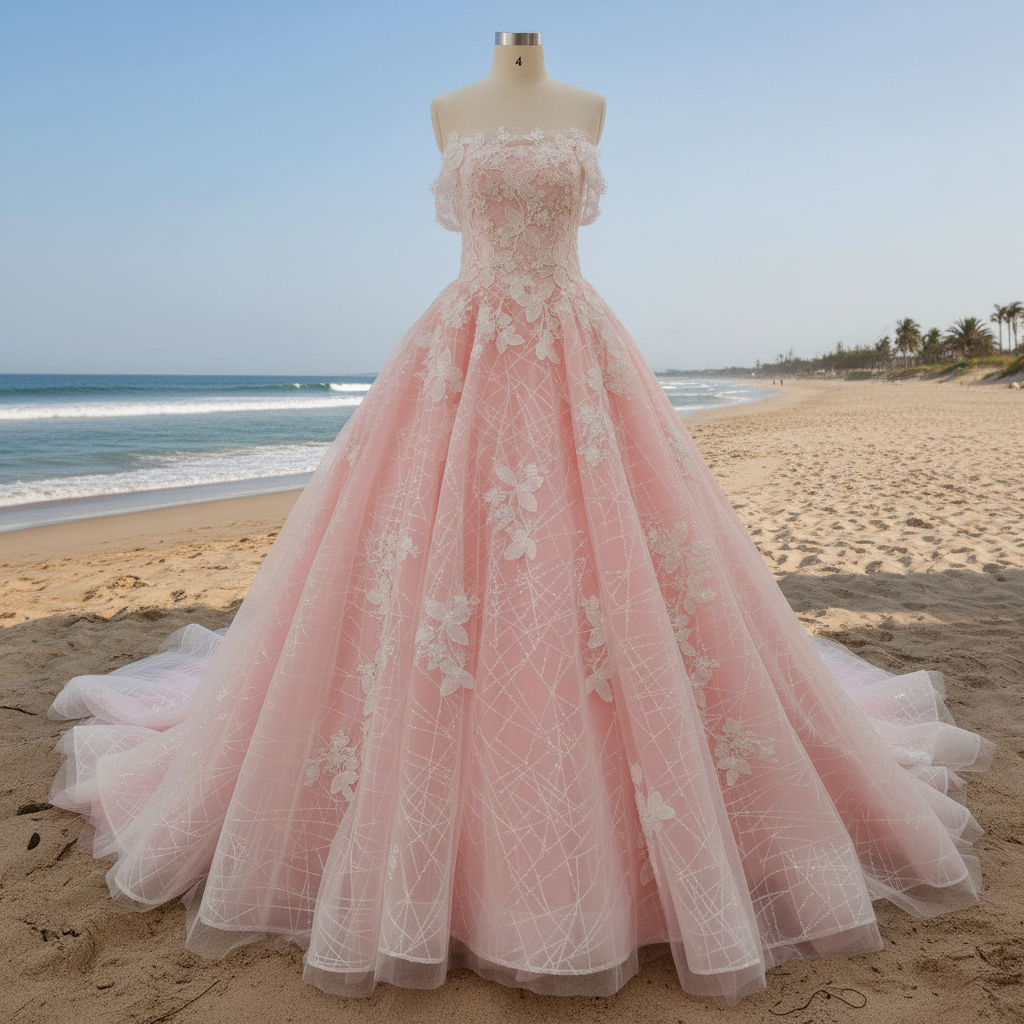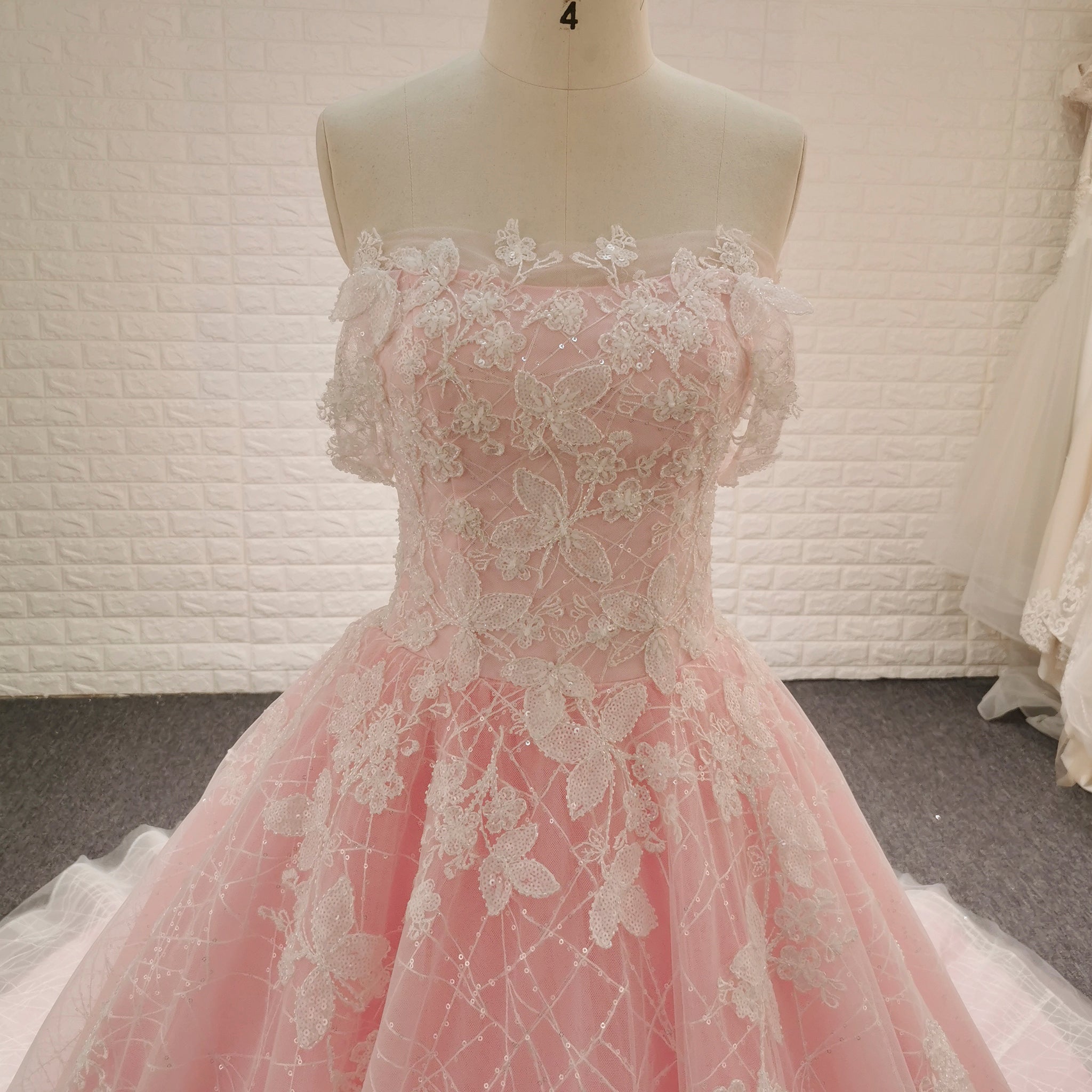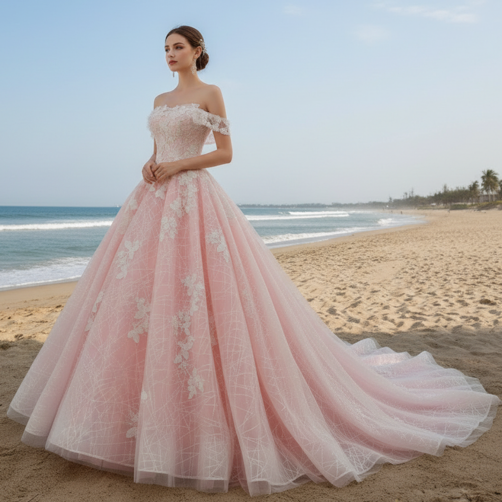 This off-the-shoulder A-line pink wedding dress masterfully combines classic beauty with contemporary design elements, making it a standout choice for brides seeking elegance with a modern twist. The delicate floral lace details are meticulously applied, creating a textured pattern that accentuates the dress’s romantic charm while drawing attention to the graceful neckline and exposed shoulders. The soft pink hue moves beyond traditional bridal colors, offering a subtle yet sophisticated statement of individuality. The A-line silhouette is designed to flatter a broad range of body types by gently contouring the waist and flowing smoothly to the hem, ensuring ease of movement and comfort throughout the day. Premium fabrics and skilled craftsmanship provide durability and a luxurious finish, guaranteeing that the wearer not only looks stunning but also feels confident and comfortable from ceremony to celebration. Ideal for weddings, homecomings, or formal occasions, this dress embodies refined style and timeless grace.