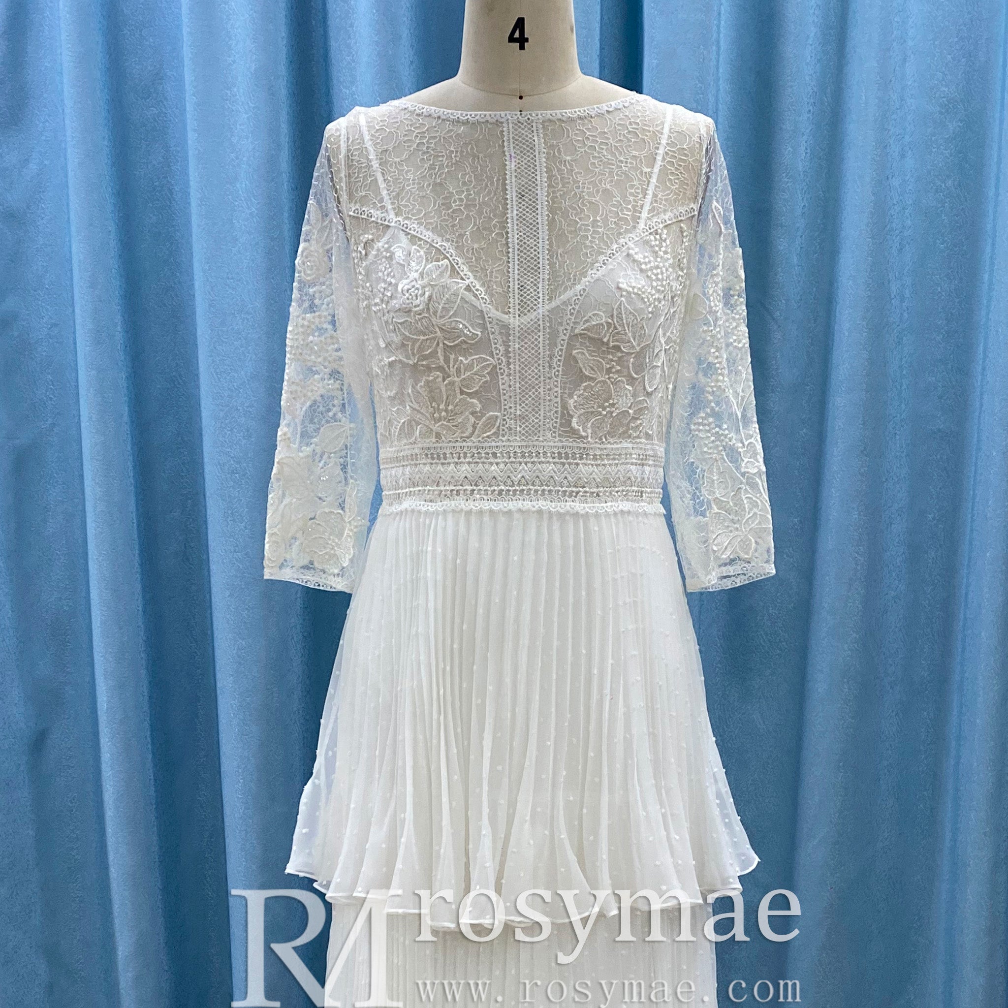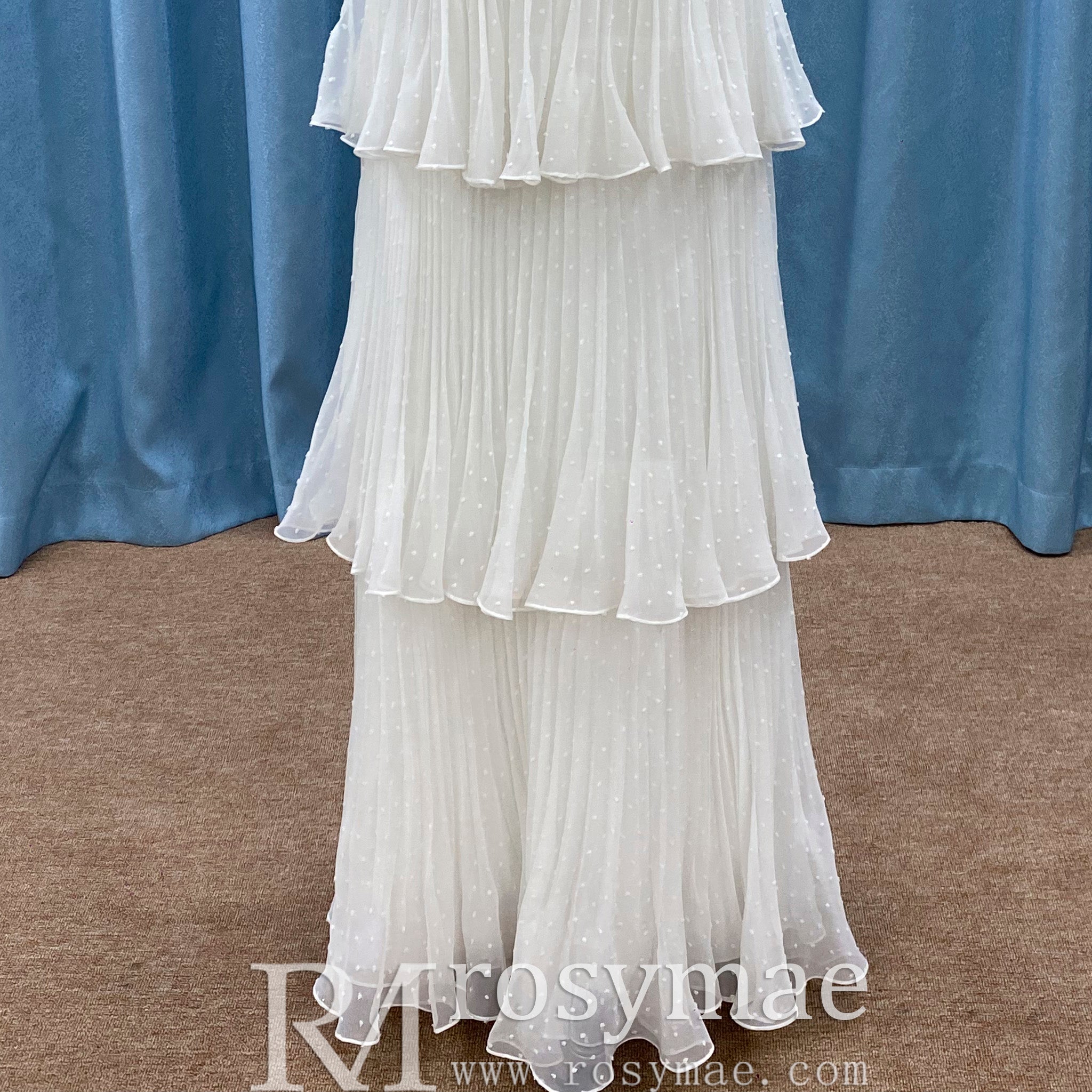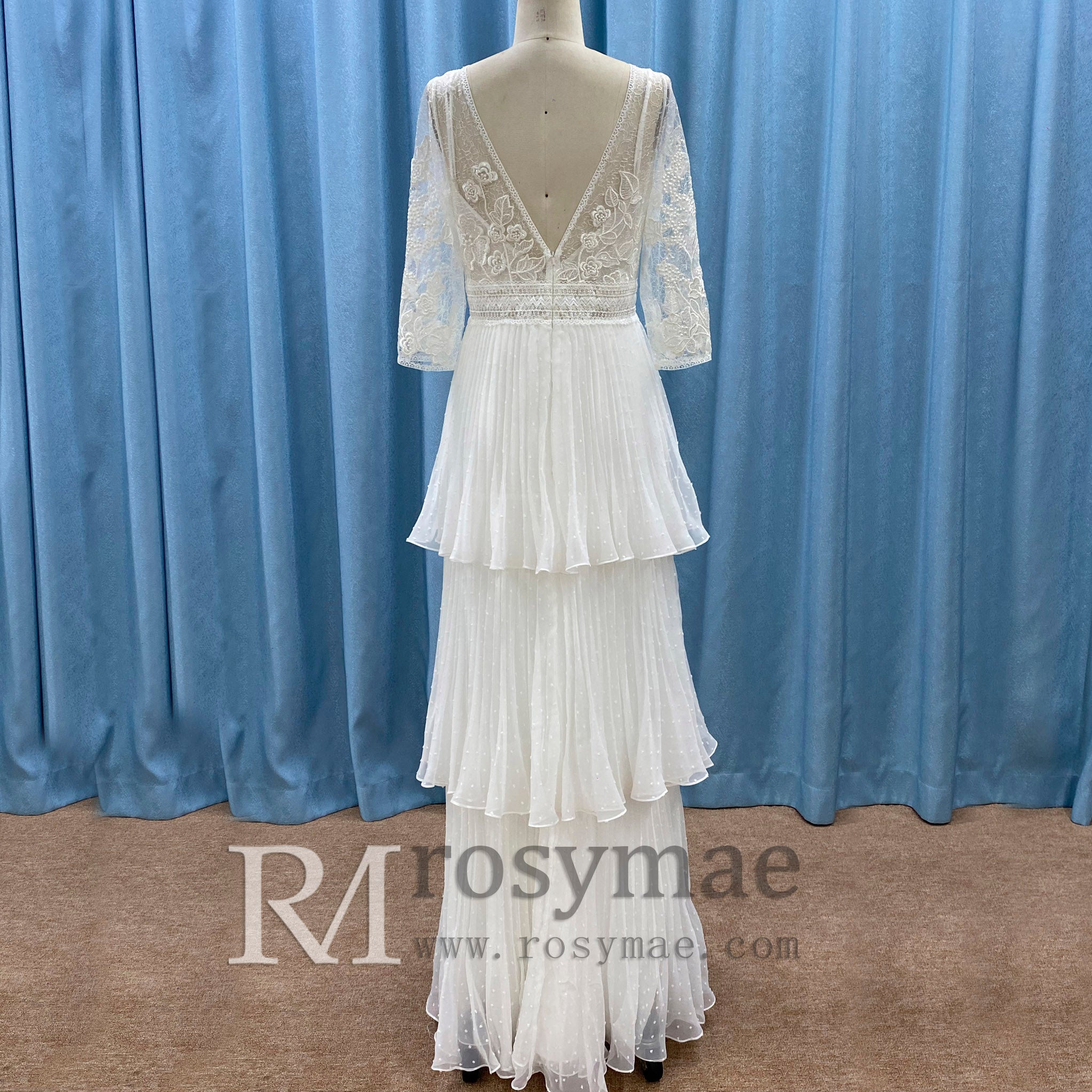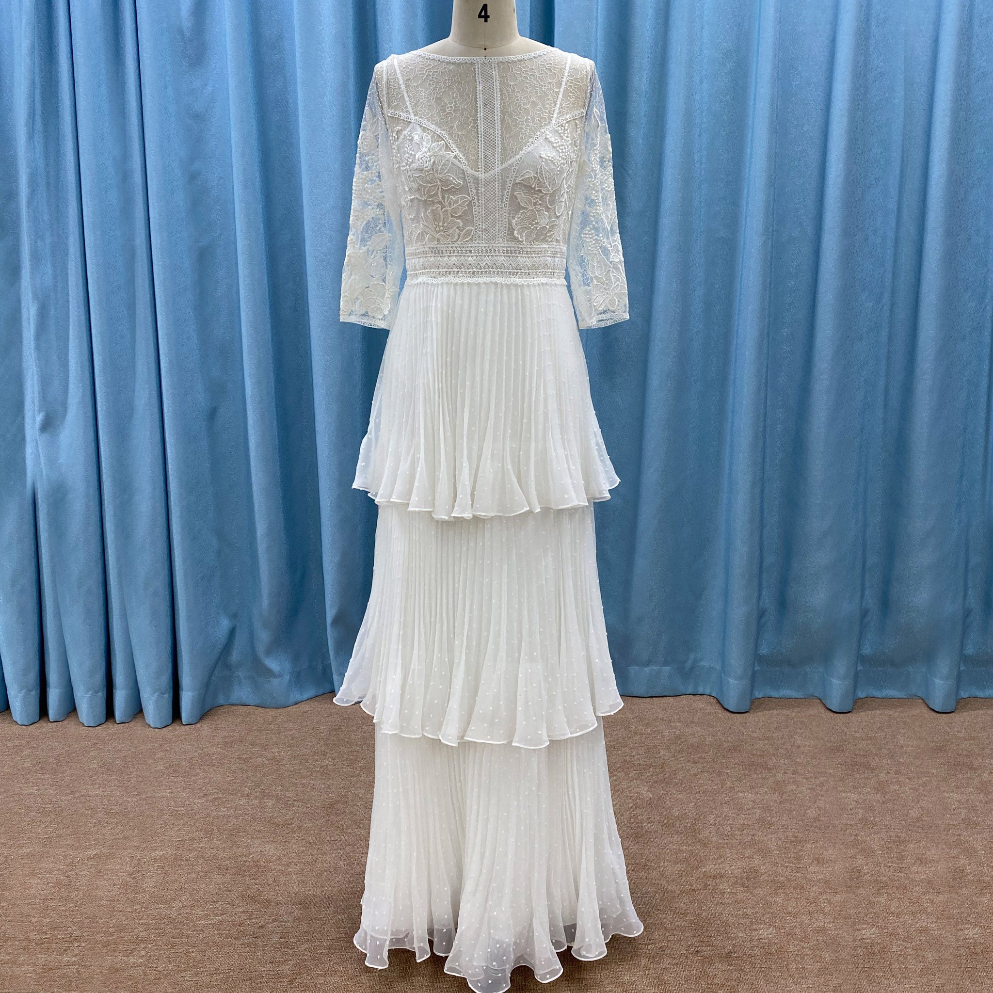 Step into your wedding day with unmatched elegance wearing this exquisite three-quarter sleeve sheer sheath wedding dress, meticulously designed to blend classic charm with contemporary sophistication. The fitted bodice molds delicately to your curves, creating a silhouette that celebrates your natural beauty and boosts your confidence. Crafted from softly flowing sheer chiffon, the fabric gently embraces you with breathable comfort, allowing graceful movement from your first step down the aisle to the last dance of the night. The gown’s multi-layered skirt adds enchanting volume and dimension, giving an ethereal, floating effect that captivates from every angle. Subtle yet striking, the three-quarter sleeves provide refined coverage while highlighting your neckline and shoulders with sheer elegance. This dress is perfect for the bride who desires a harmonious mix of modern design and timeless grace, ensuring you not only feel radiant but also leave an unforgettable impression on your guests throughout your celebration. Make every moment magical in a gown crafted to enhance your beauty and make your dream wedding a reality.