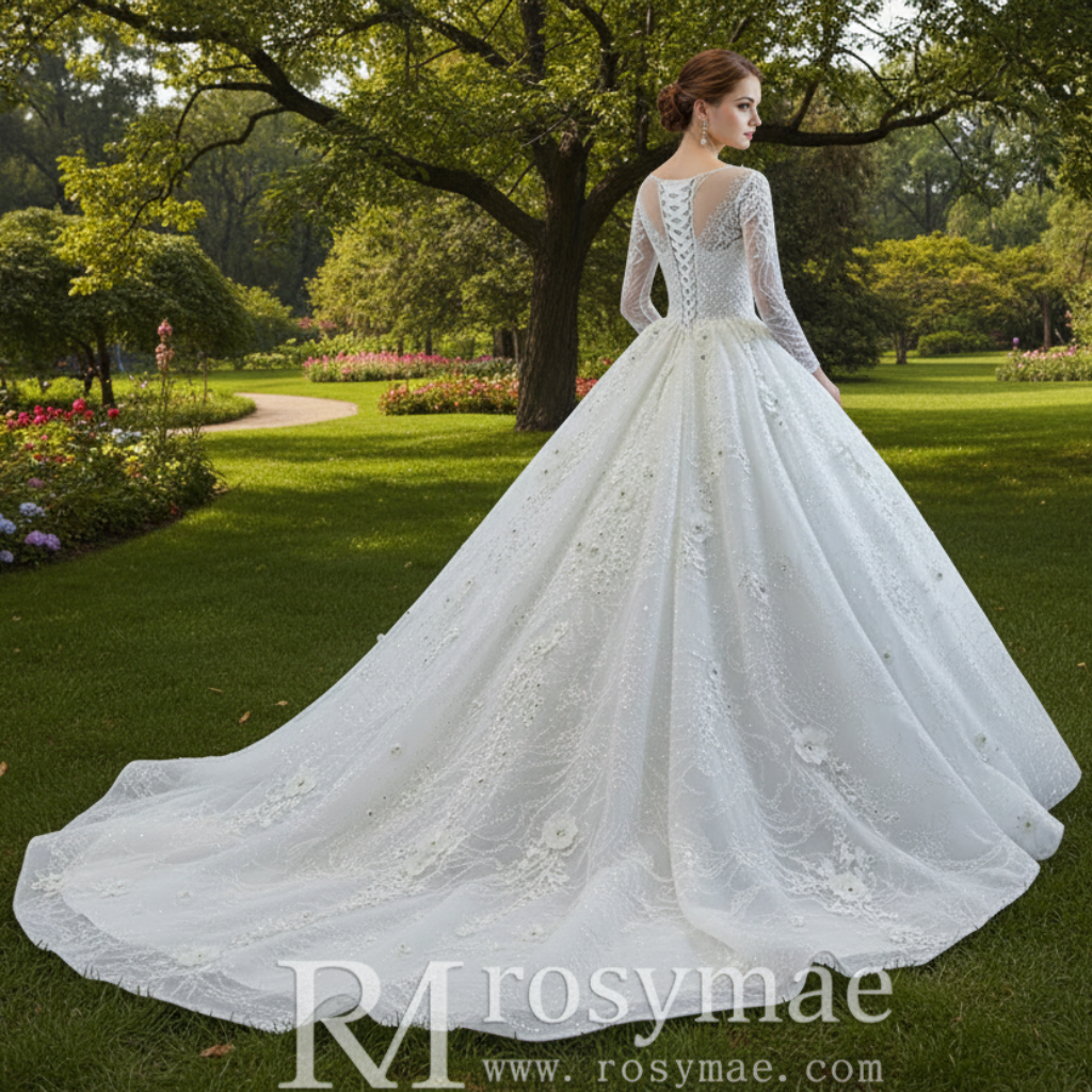 Step into a fairytale with this breathtaking handmade wedding dress, where botanical artistry meets royal elegance. This exquisite gown features meticulously crafted 3D floral appliqués that bloom across the bodice and skirt, creating a dimensional garden of delicate petals and leaves. The luxurious sparkle tulle shimmers with every movement, while the elegant long sheer sleeves provide a touch of vintage romance with their delicate transparency and subtle sparkle.