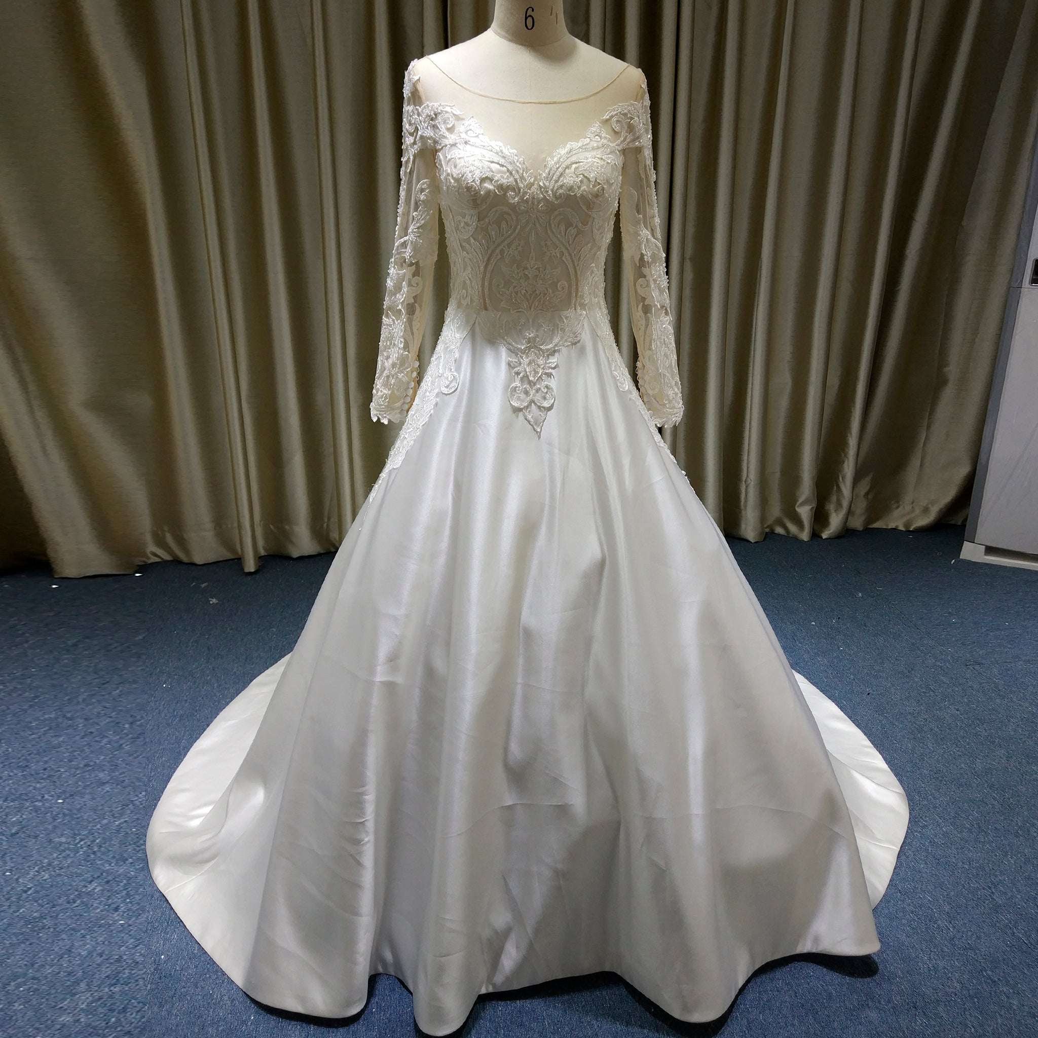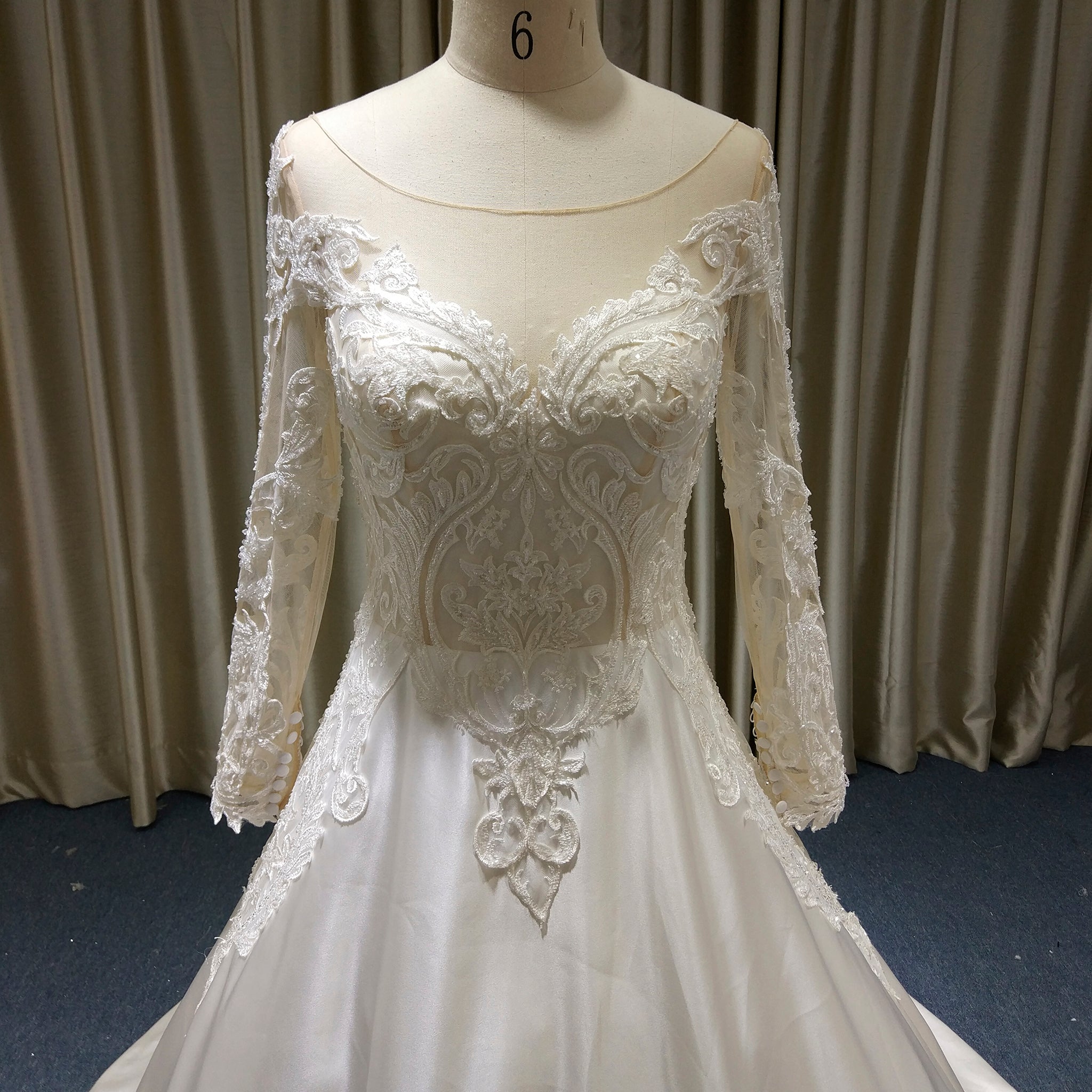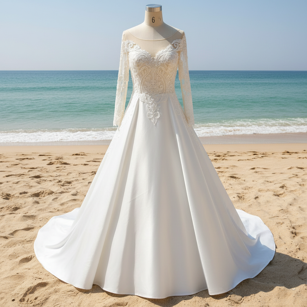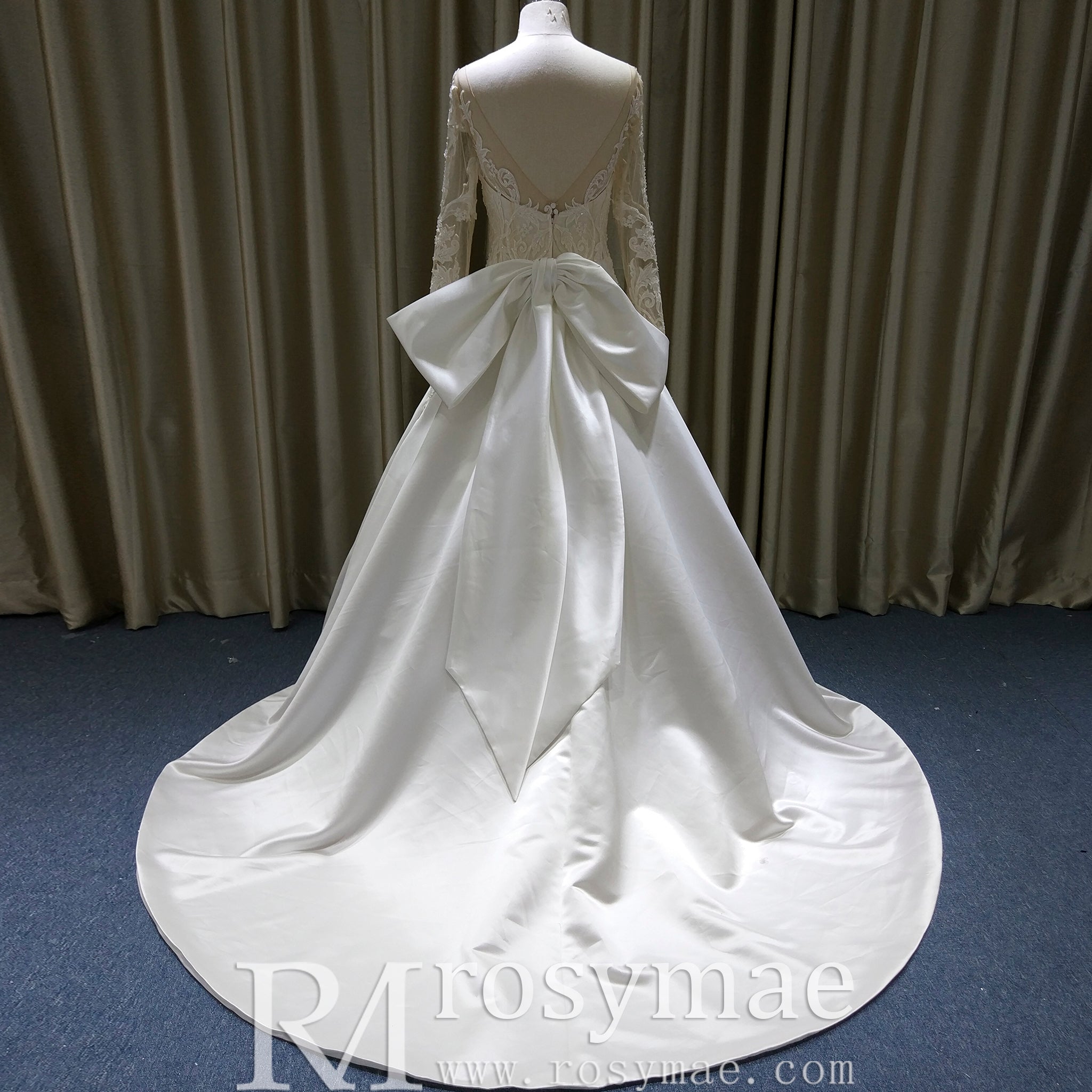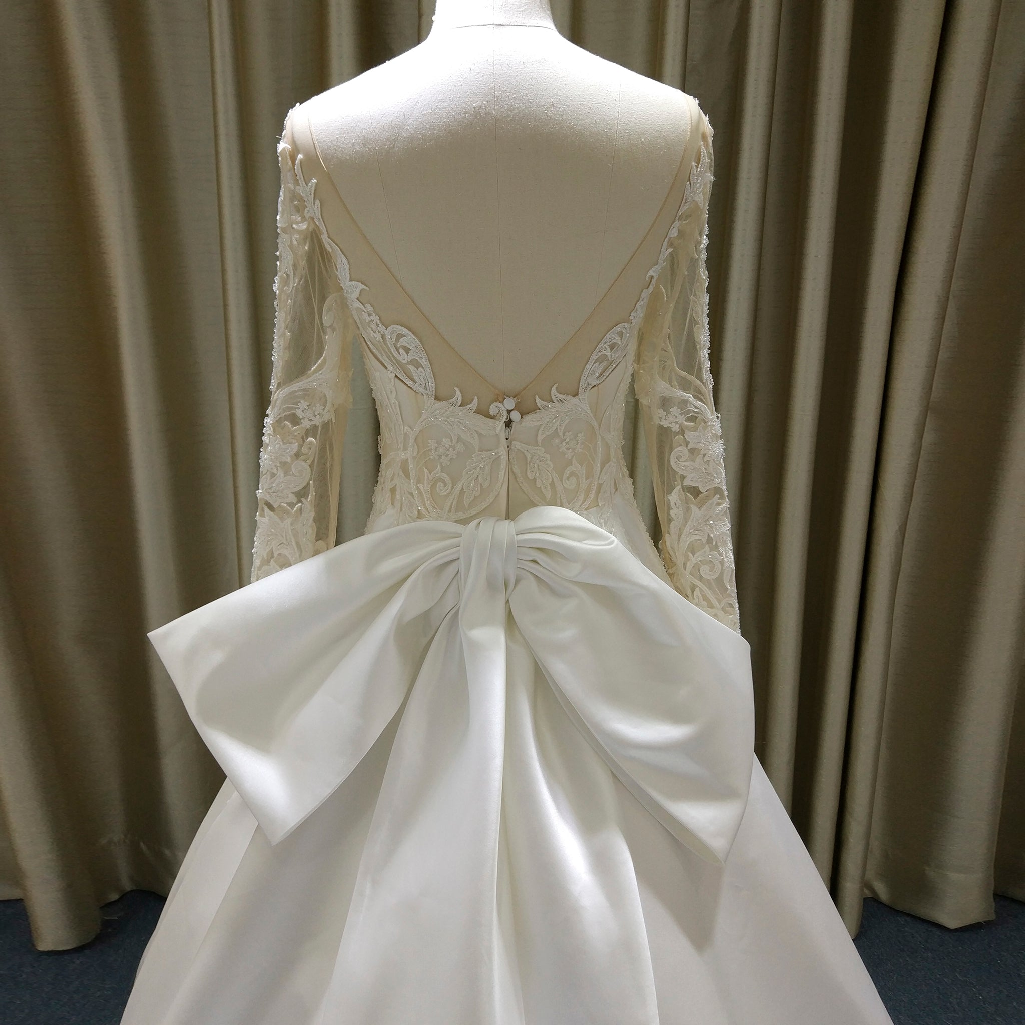 This classic long sleeve A-line wedding dress embodies timeless elegance and intricate craftsmanship, making it an exquisite choice for discerning brides. The open low back is beautifully framed by a delicate bowknot, which adds a subtle romantic detail while accentuating the natural curves, enhancing the overall silhouette with grace and sophistication. The sheer scoop neckline and bodice, along with the sheer sleeves, offer a light, airy quality that balances modesty with a hint of sensuality, creating an ethereal aesthetic. Finely embroidered floral lace appliqués are expertly placed on the sheer fabric, adding dimension and a tactile richness that catches and reflects light with every movement, elevating the gown’s visual appeal. The A-line skirt flows with gentle ease, designed to flatter various body types by skimming the waist and gracefully cascading to the floor, ensuring both elegance and comfort throughout your wedding day. This dress is a masterful fusion of classic design and delicate detail, making it a standout gown that promises to make your moment unforgettable.