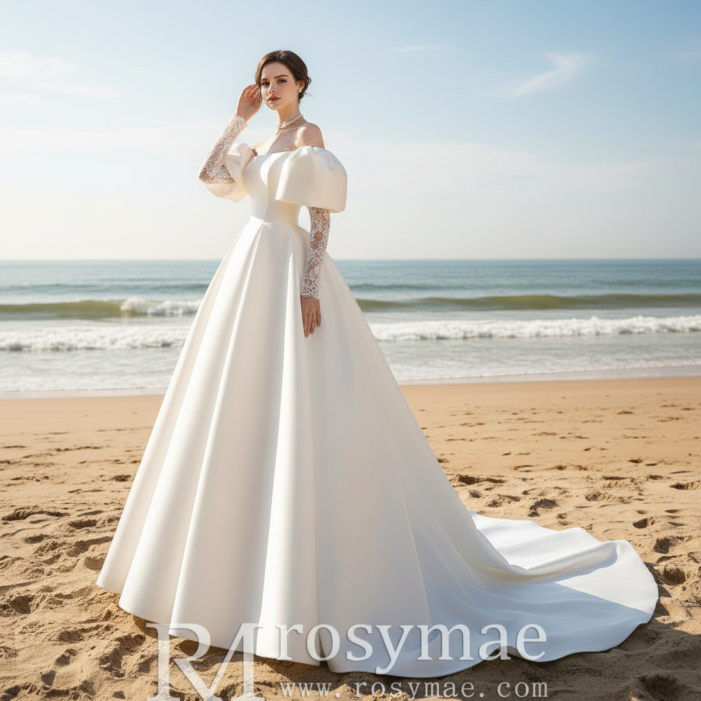 This elegant vintage ball gown wedding dress features an off-the-shoulder neckline, long lantern sleeves, and a beautifully detailed cathedral train. The satin material and ball gown silhouette add a touch of luxury, while the delicate pearl back adds a touch of romance. Perfect for a classic and timeless wedding look.