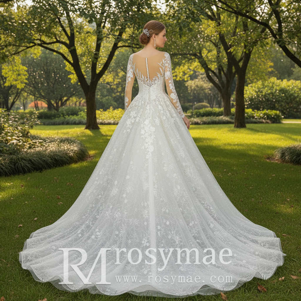 Princess Lace Ball Gown Wedding Dress Illusion Long Sleeve