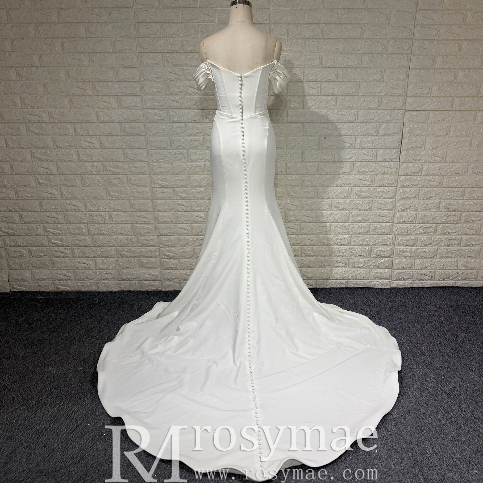Elegant Off Shoulder Satin Mermaid Simple Wedding Dress with Leg Slit