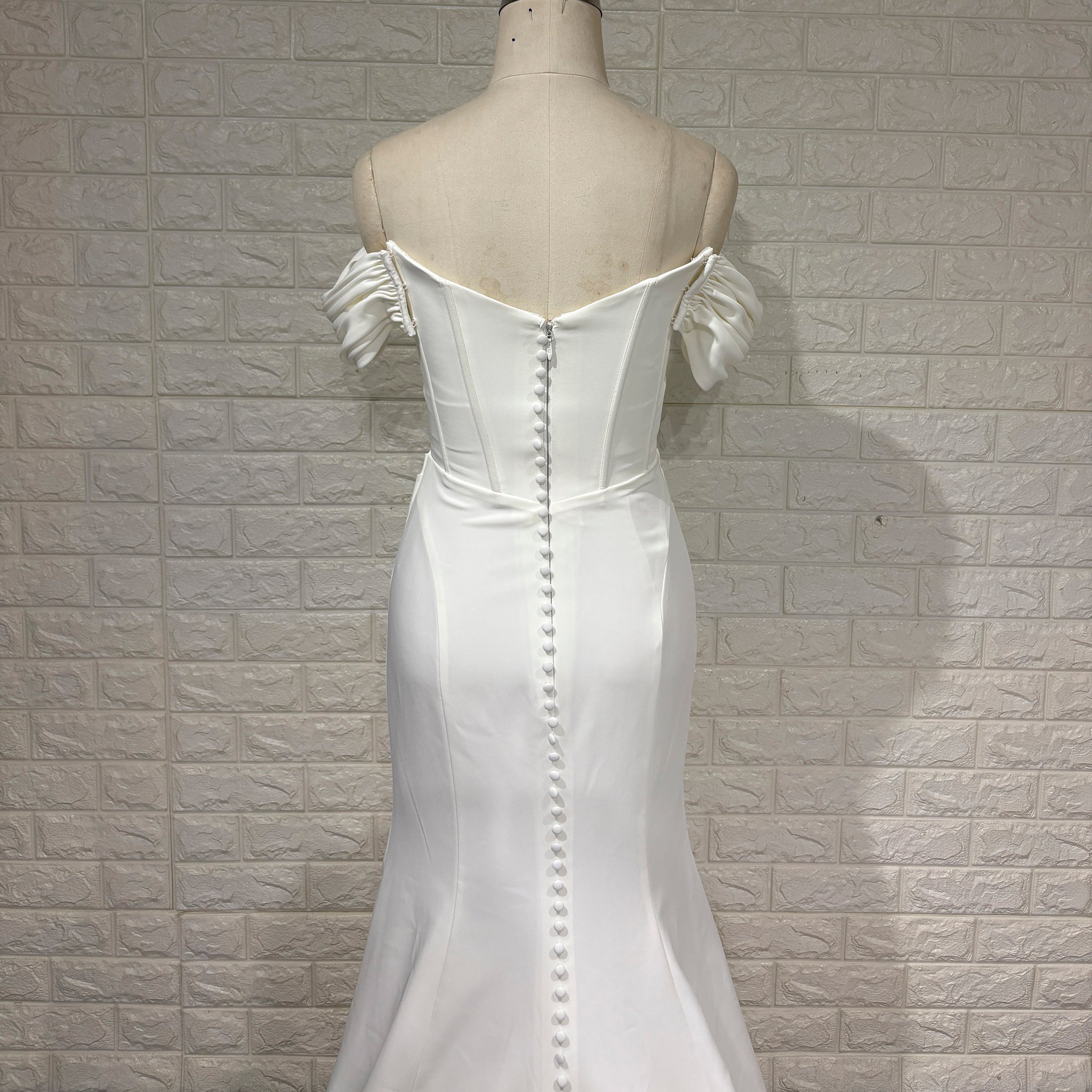 This gorgeous off-shoulder satin mermaid wedding dress effortlessly combines simplicity with refined elegance through its delicate ruched detailing. The sleek, form-fitting silhouette accentuates your curves, creating a flattering and timeless look that highlights your natural beauty. The dramatic chapel train flows gracefully behind you, lending a breathtaking and regal presence as you make your grand entrance. Enhanced by a tasteful leg slit, this dress introduces a modern touch of attractive and movement without sacrificing its classic charm. Meticulously crafted from smooth satin, it promises comfort throughout your special day, allowing you to move with confidence and grace. The ruched bodice adds subtle texture and dimension, enhancing the gown’s sophisticated appeal. Whether exchanging vows or celebrating with loved ones, this dress ensures you’ll stand out with effortless poise and elegance. Perfect for brides who desire a stunning gown that seamlessly balances tradition and contemporary style, this dress is designed to make your wedding day truly unforgettable.
