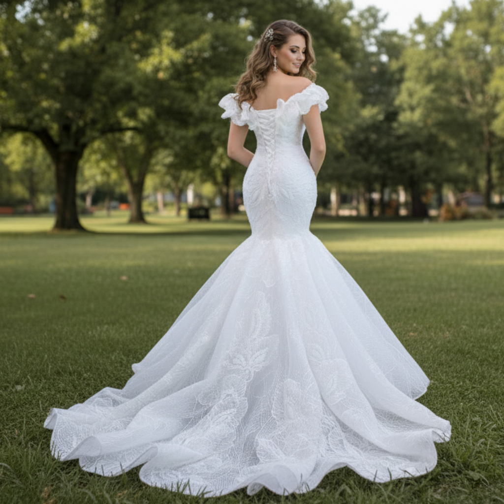 Embrace a vision of ethereal romance in this meticulously handcrafted off-the-shoulder trumpet wedding dress, where delicate lace meets whimsical feather accents. This exquisite gown showcases a flattering V-neckline that elegantly frames the collarbone, while the off-the-shoulder design gracefully drapes into soft ruffle sleeves for a touch of vintage-inspired charm. The intricate lace appliqué, carefully hand-placed along the trumpet silhouette, flows into artistic feather detailing that adds movement and a dreamlike quality to your walk down the aisle.