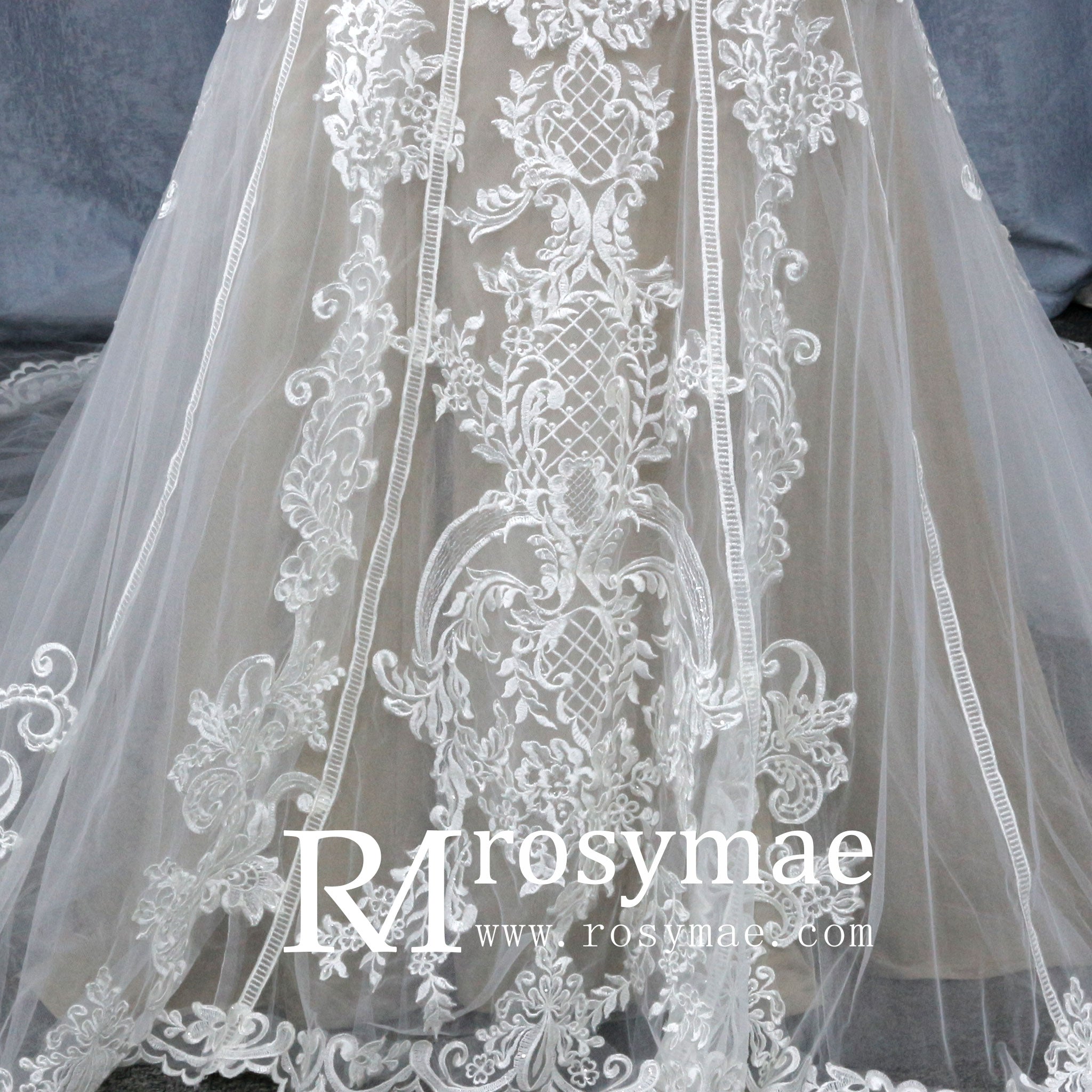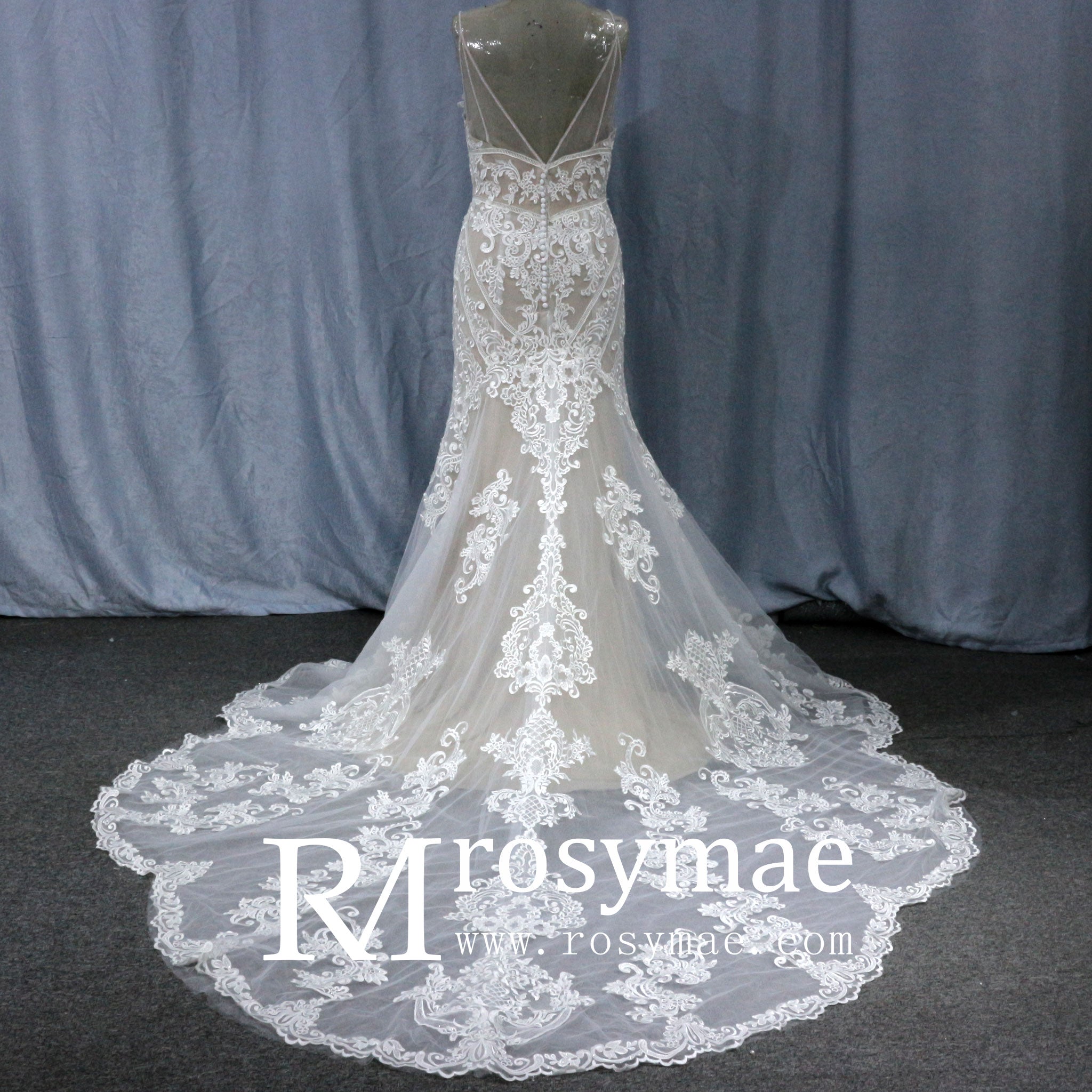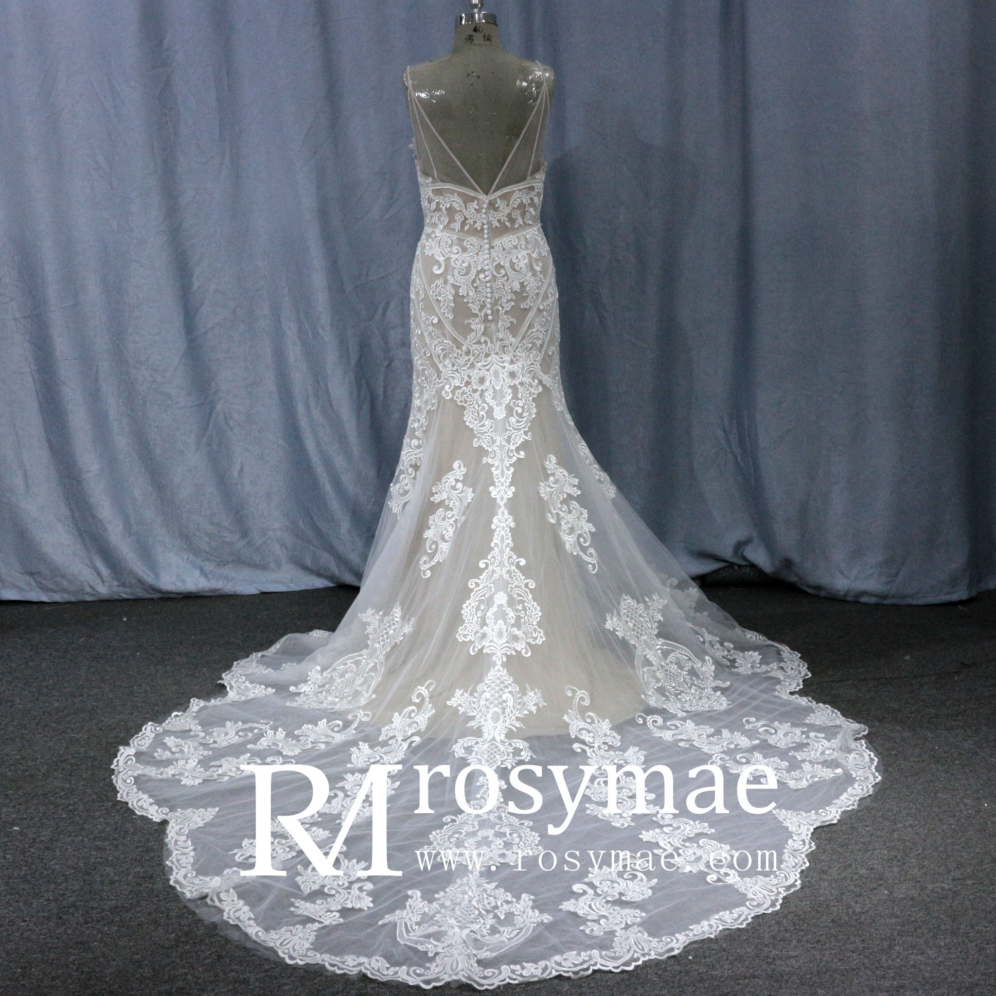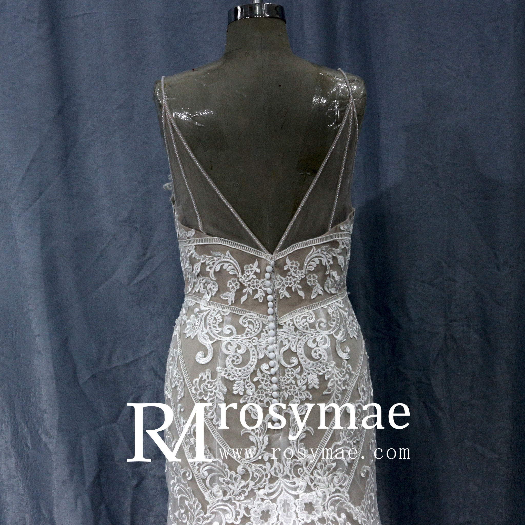 This hand-made mermaid beach wedding gown boasts a V-neck design and elegant spaghetti straps. Its unique leaf-shaped train and beautiful colors of ivory and skin tone make it a one-of-a-kind choice for a stunning and unforgettable wedding look. Perfect for brides looking for a modern and romantic touch.