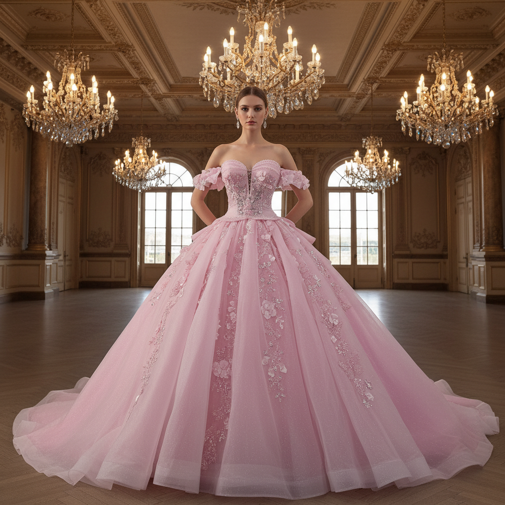This pink, off-the-shoulder ball gown is the embodiment of fairytale romance, meticulously designed for Quinceañeras, Sweet 16 celebrations, or a whimsical wedding day. The princess silhouette features a full, puffy tulle skirt that creates a dreamy, cloud-like volume, ensuring every step feels like a dance through a storybook. The off-the-shoulder sweetheart neckline frames the shoulders and décolletage with timeless grace, while the bodice comes alive with delicate floral embroidery, intricate lace appliqués, and stunning 3D floral embellishments that bloom across the fabric. A lace-up back ensures a customizable, figure-flattering fit, adding both structure and romance. The cathedral train extends gracefully behind, offering a dramatic, elegant finish that trails beautifully during the ceremony. This gown is a celebration of youth, beauty, and unforgettable moments.