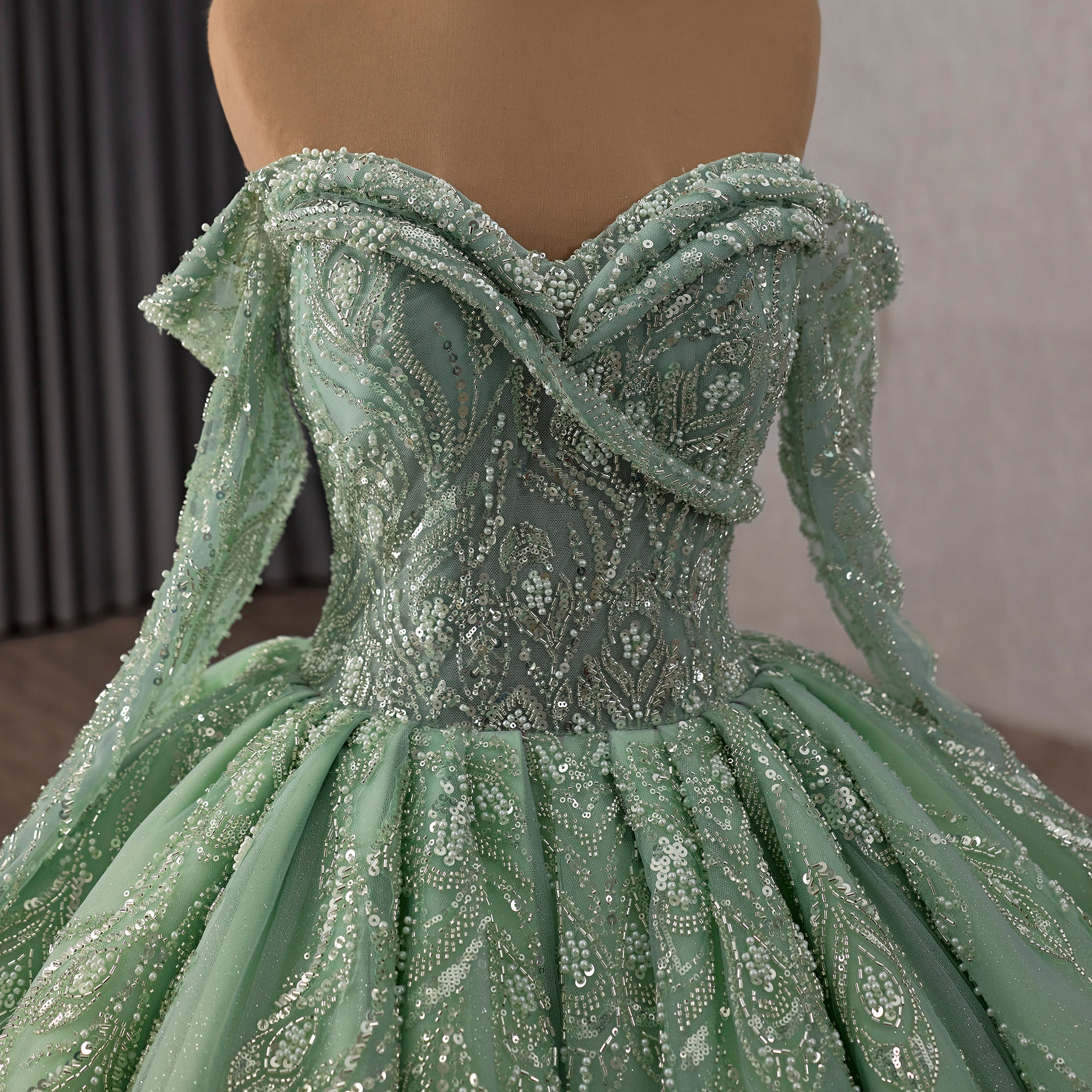 This stunning sage green ball gown is an ornate masterpiece, thoughtfully designed for formal events such as Quinceañeras, proms, or elegant galas. The soft, muted green hue offers a fresh, romantic alternative to traditional pastels, evoking a sense of ethereal garden elegance. The voluminous floor-length skirt creates a dramatic, fairy-tale silhouette, while the off-the-shoulder sweetheart neckline frames the shoulders and décolletage with timeless grace. Throughout the bodice and sleeves, intricate beaded or sequined floral patterns bloom with shimmering detail, catching the light with every movement. The fitted bodice transitions seamlessly into the full, flowing skirt, creating a balanced and flattering shape. A perfect choice for the young woman seeking a look that is both sophisticated and enchantingly romantic.