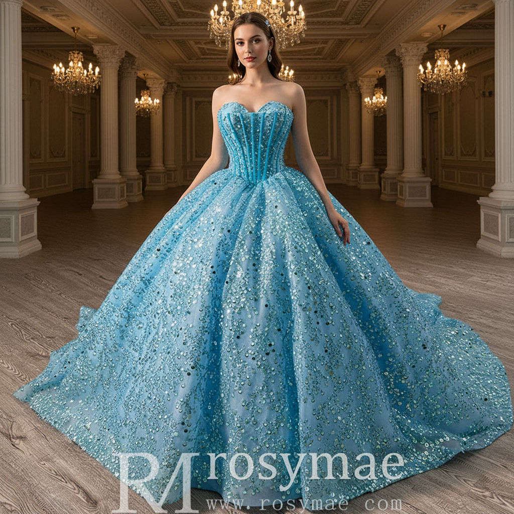 Dress to impress with this sparkly dress! This high-end, charming dress features intricate beading and sequins, a sweetheart neckline, and a sweep train. Perfect for prom or any formal occasion, it will make you feel like a true princess. Shine bright and turn heads with this stunning dress!