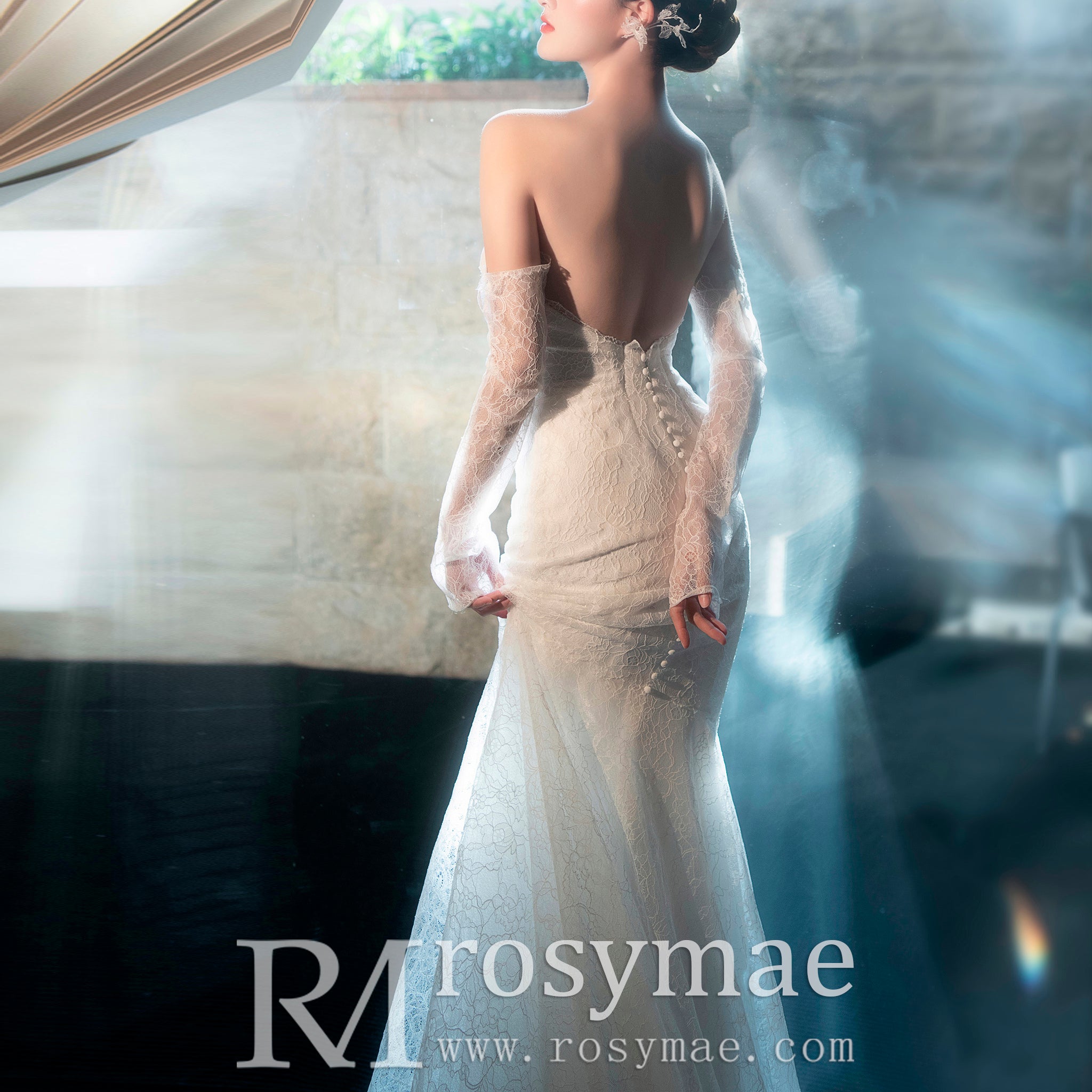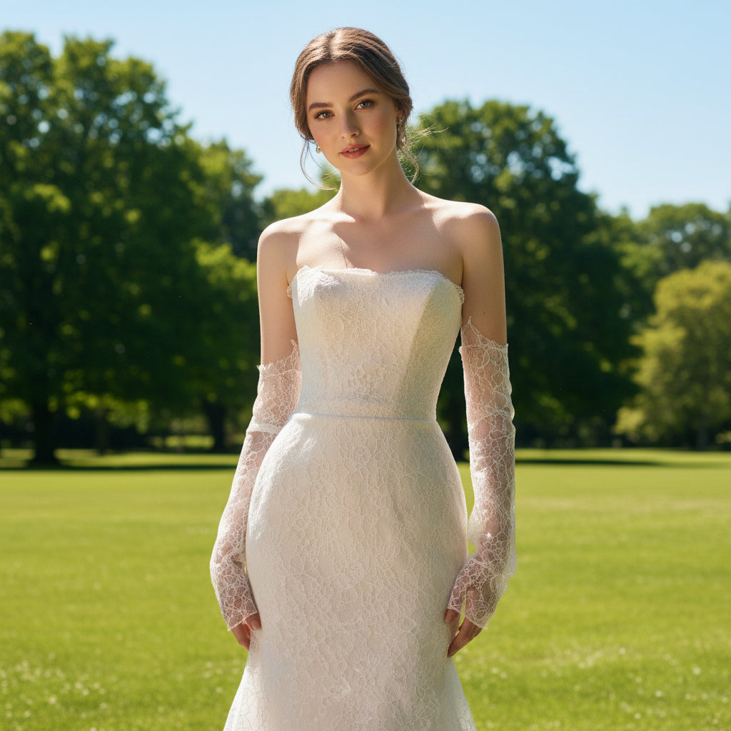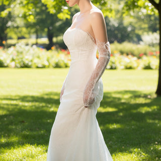 This beach wedding dress features a strapless design and low back, secured with a zipper and buttons. Its lightweight mermaid lace construction is delicate yet durable, making it the perfect choice for any seaside celebration. Enjoy a comfortable and elegant fit on your special day.