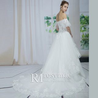 Classic A-line Tulle Lace Appliqued Wedding Dress with Capped Sleeve