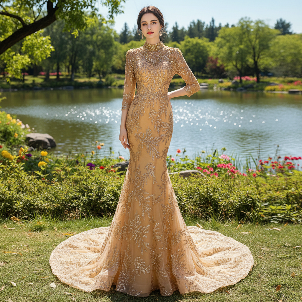 Get ready to dazzle in this high neck champagne gold prom dress with three quarter sleeve! Its high mock neck adds sophistication while the sparkly material will make you shine all night long. Fit and flare style and top it off with a stunning chapel train. Complete your prom look with this show-stopping evening gown.