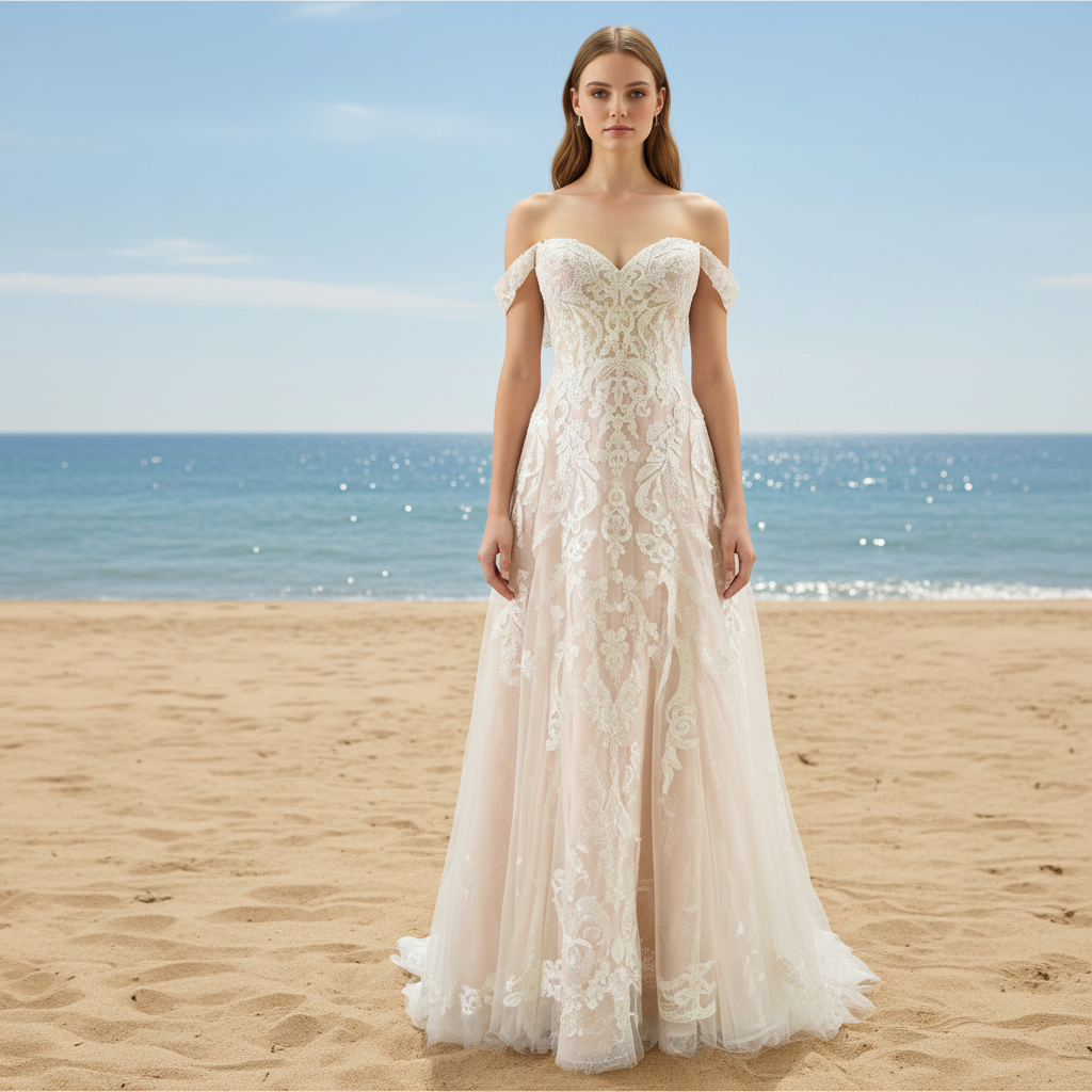 This exquisite off-the-shoulder wedding dress combines timeless elegance with modern romance. The sweetheart neckline and graceful A-line silhouette create a flattering, feminine silhouette that celebrates your special day. Crafted from premium soft tulle and delicate lace detailing across the bodice and skirt, the gown offers both visual richness and comfortable wear. The off-shoulder sleeves add a contemporary touch while maintaining classic bridal sophistication. Features include a mid-back design, secure zipper closure, and an elegant brush train that adds movement and drama as you walk. Perfect for brides seeking a dress that balances romantic charm with refined style.
