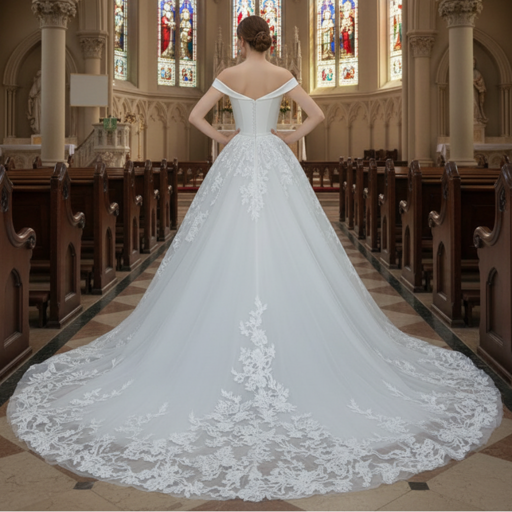 This off shoulder wedding dress bridal gown features a detachable train, providing versatility and convenience for the bride-to-be. Enjoy the option to switch up your look from ceremony to reception without sacrificing style. Elevate your wedding day experience with this convertible skirt dress.