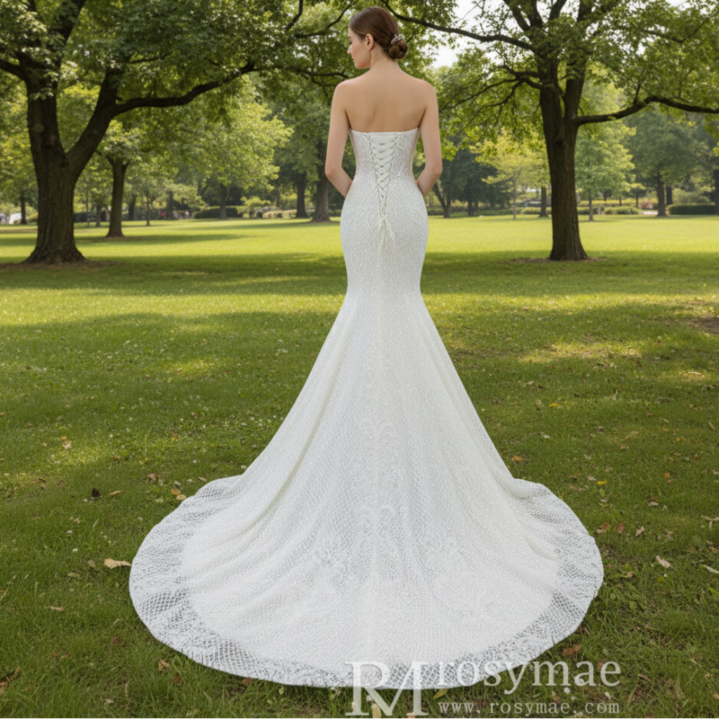 Embody elegance and grace on your special day with this princess Vneck trumpet lace wedding dress. The delicate lace detailing, strapless design, and handmade craftsmanship create a stunning silhouette. The detachable train adds a touch of drama and versatility. Walk down the aisle in style and make a statement with your cathedral train.