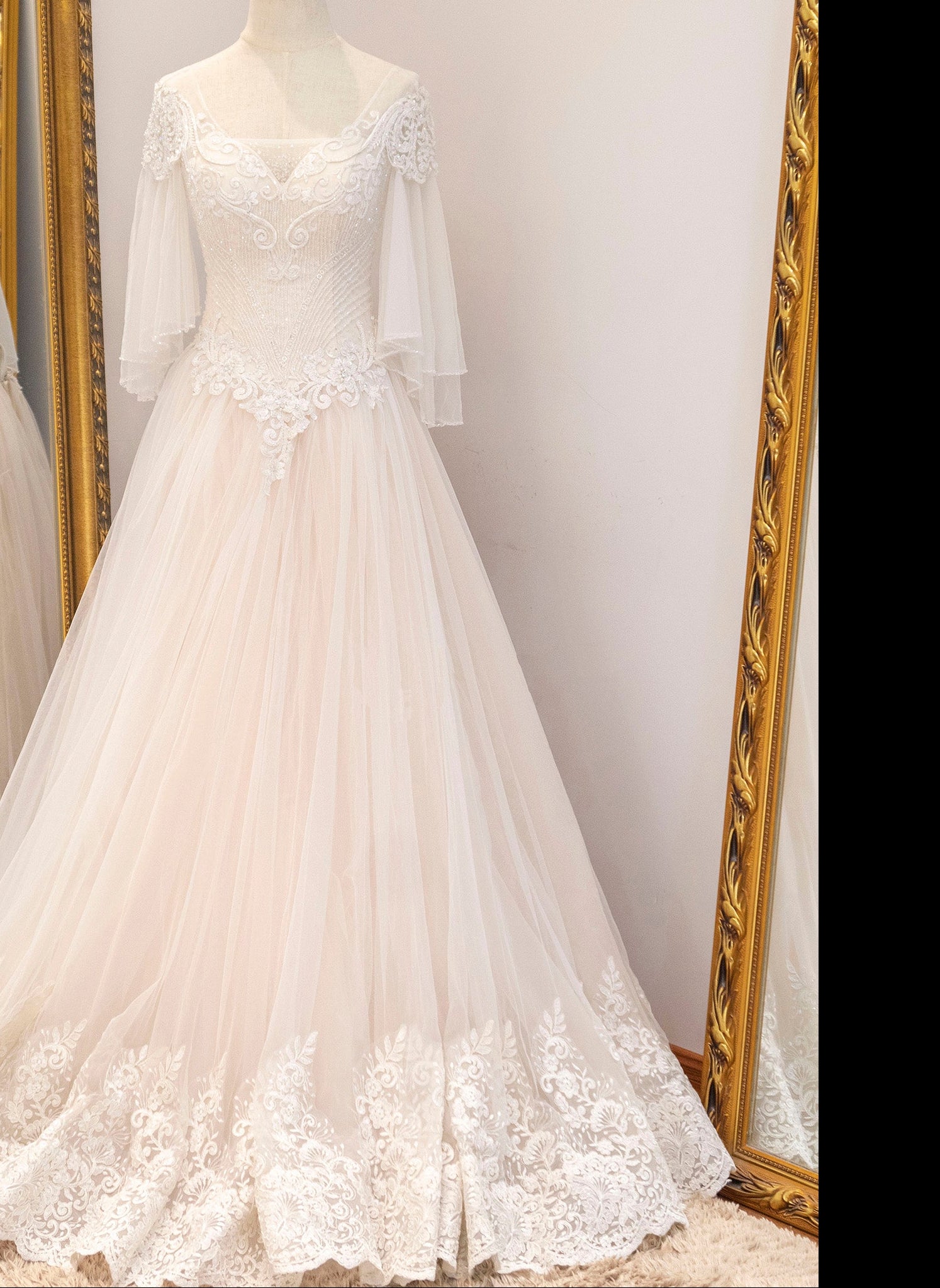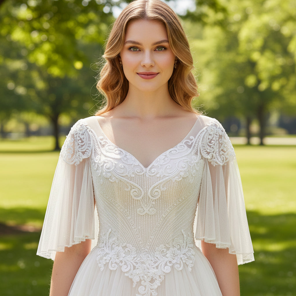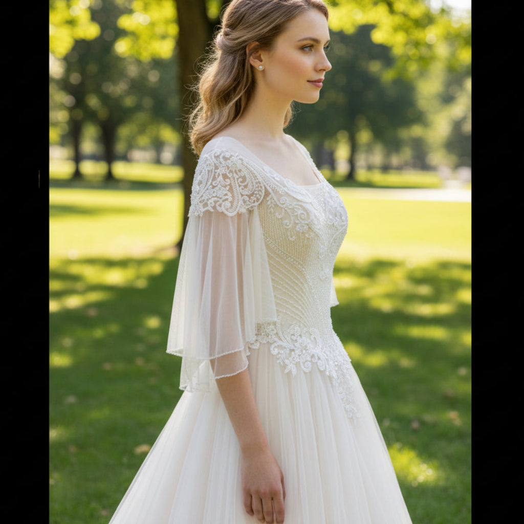 This beautiful A-line wedding dress features layered tulle and lace, creating a breathtaking look. Its half flowy sleeves add extra elegance to the design. Perfect for the modern bride, this bridal gown is sure to make a statement as you walk down the aisle.
