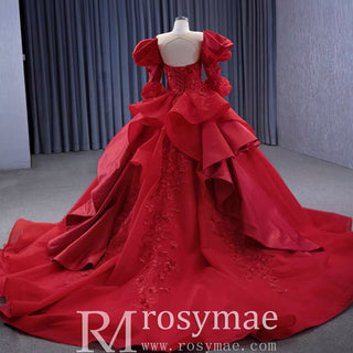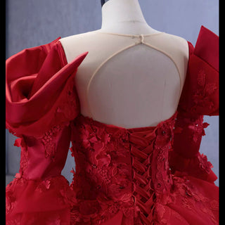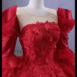 Step into timeless elegance with this exquisite vintage-inspired ball gown, designed to create a truly memorable entrance. The graceful scoop neckline and elegant 3/4 sleeves beautifully frame the upper body, while the voluminous puffy skirt flows into a dramatic cathedral train. A delicate keyhole back adds a sophisticated detail to the silhouette, enhancing its classic charm. Expertly handmade with meticulous attention to detail, this high-end gown features luxurious ruffles and impeccable construction, making it perfect for quinceañeras, galas, and other special occasions where you want to radiate confidence and grace.