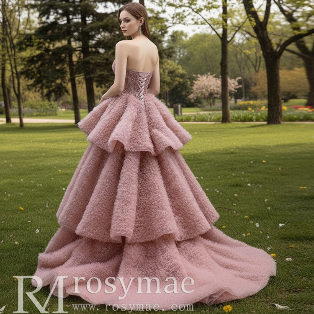 Indulge in the sheer elegance and exquisite craftsmanship of this ruffle formal prom dress. The strapless, v-neck design is accentuated by a low corset back, creating a stunning a-line silhouette. Adorned with intricate beadwork, this gown is handmade with care. Choose dusty rose for a romantic touch, and revel in the multi-layered flow. Excellent quality that exceeds expectations.