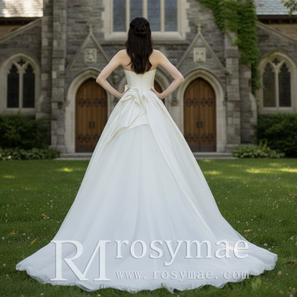 Elevate your wedding day look with our satin and tulle strapless wedding dress. Featuring a low back and elegant chapel train, this asymmetrical gown will make you feel like a true princess. Perfect for the modern bride looking for a touch of romance.