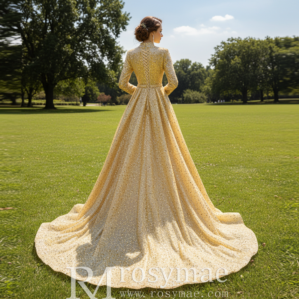 Long Sleeve Sparkly Gold Sequins Evening Dress Mock Neck Prom Gown