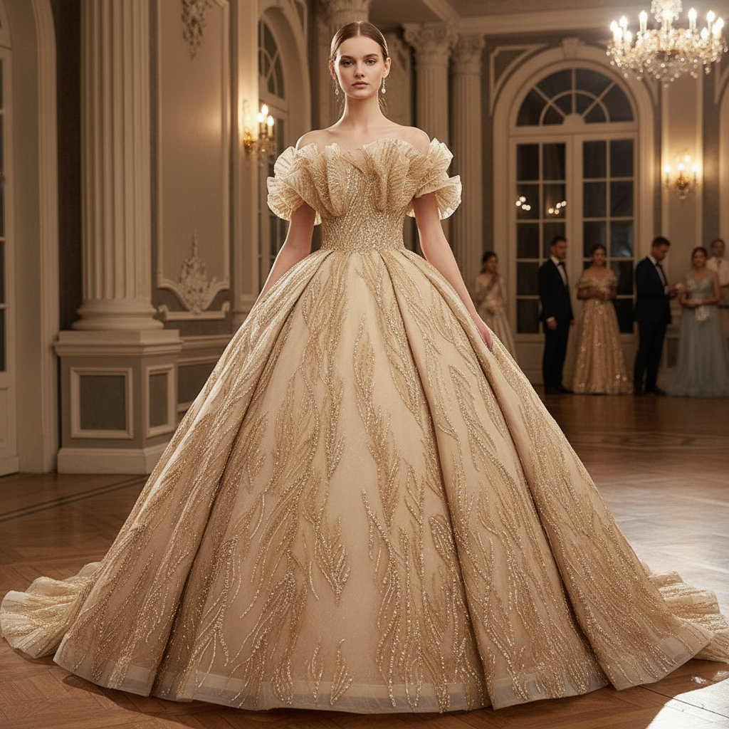 Expertly handcrafted, this luxurious prom dress features stunning champagne gold glitter sequins that will make you stand out at any formal or party event. The off-the-shoulder design adds a touch of elegance, perfect for quinceaneras and informal weddings. Complete your look with this excellent, one-of-a-kind dress.