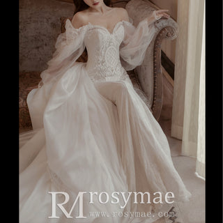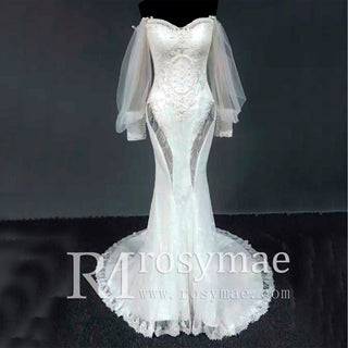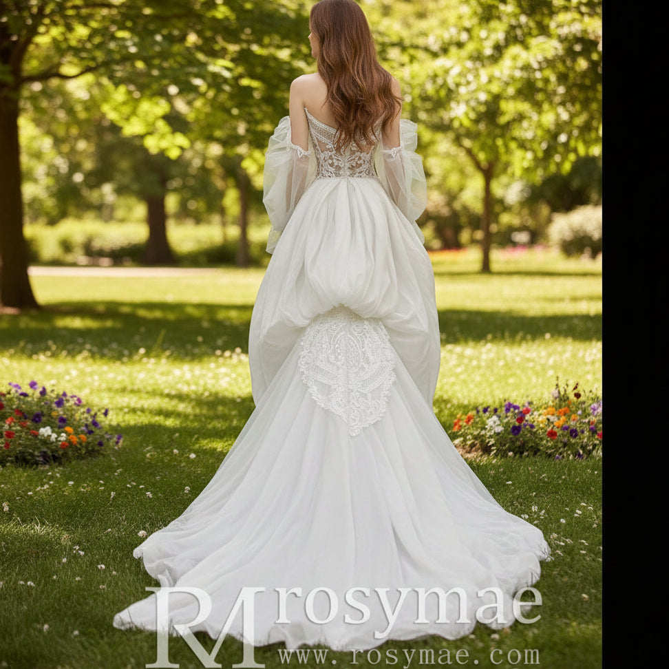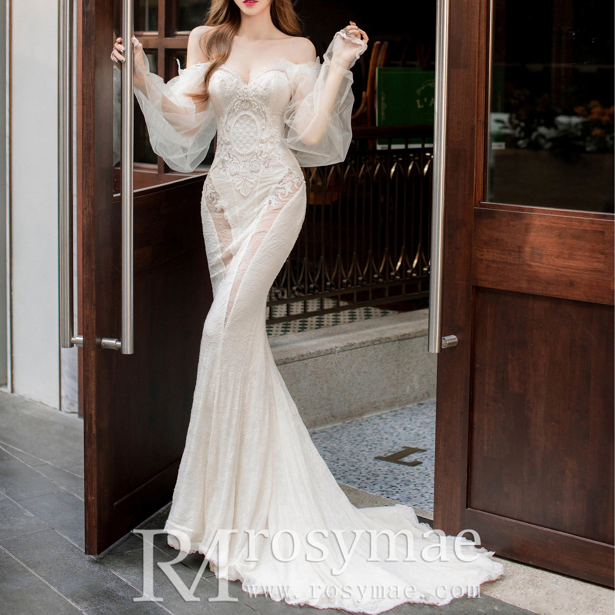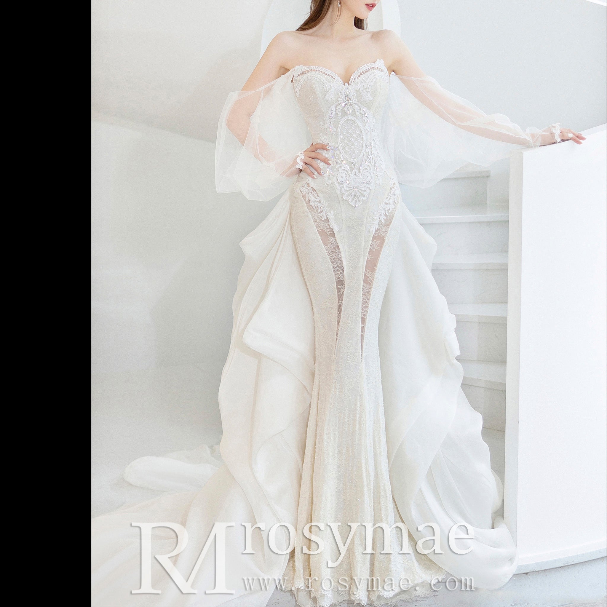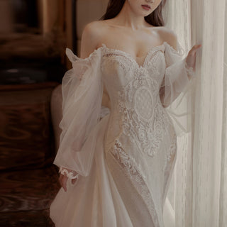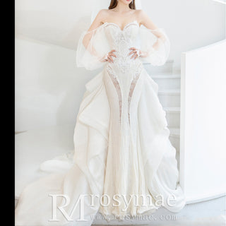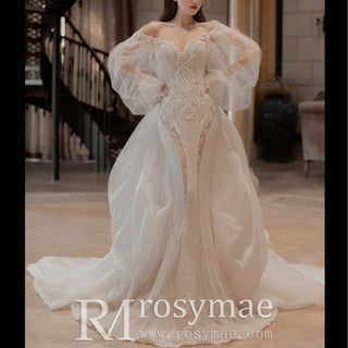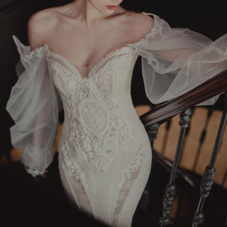 Turn heads with this on-trend mermaid bridal gown that combines contemporary style with timeless elegance. The distinctive lantern sleeves create a fashion-forward silhouette that sets you apart while providing graceful, flattering coverage. Delicate pearls are strategically placed throughout the gown, catching light beautifully and creating a luminous sparkle that photographs absolutely stunning. The fitted mermaid silhouette hugs your curves in all the right places before flowing into an elegant fishtail, creating a silhouette that celebrates your natural beauty and commands attention. The sheer skirt detailing adds an ethereal quality and romantic touch, balancing the gown's modern elements with timeless femininity. What truly elevates this dress is the ingenious detachable train—offering you complete flexibility to transition from a dramatic ceremony entrance to an elegant reception where you can move freely and celebrate without restriction. This is the ultimate choice for the fashion-conscious bride who wants to stay ahead of trends without sacrificing sophistication. Perfect for the modern woman who refuses to blend in—a gown that celebrates your individuality, style, and the magic of your special day with undeniable presence and unforgettable allure.