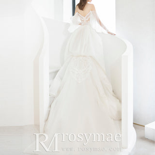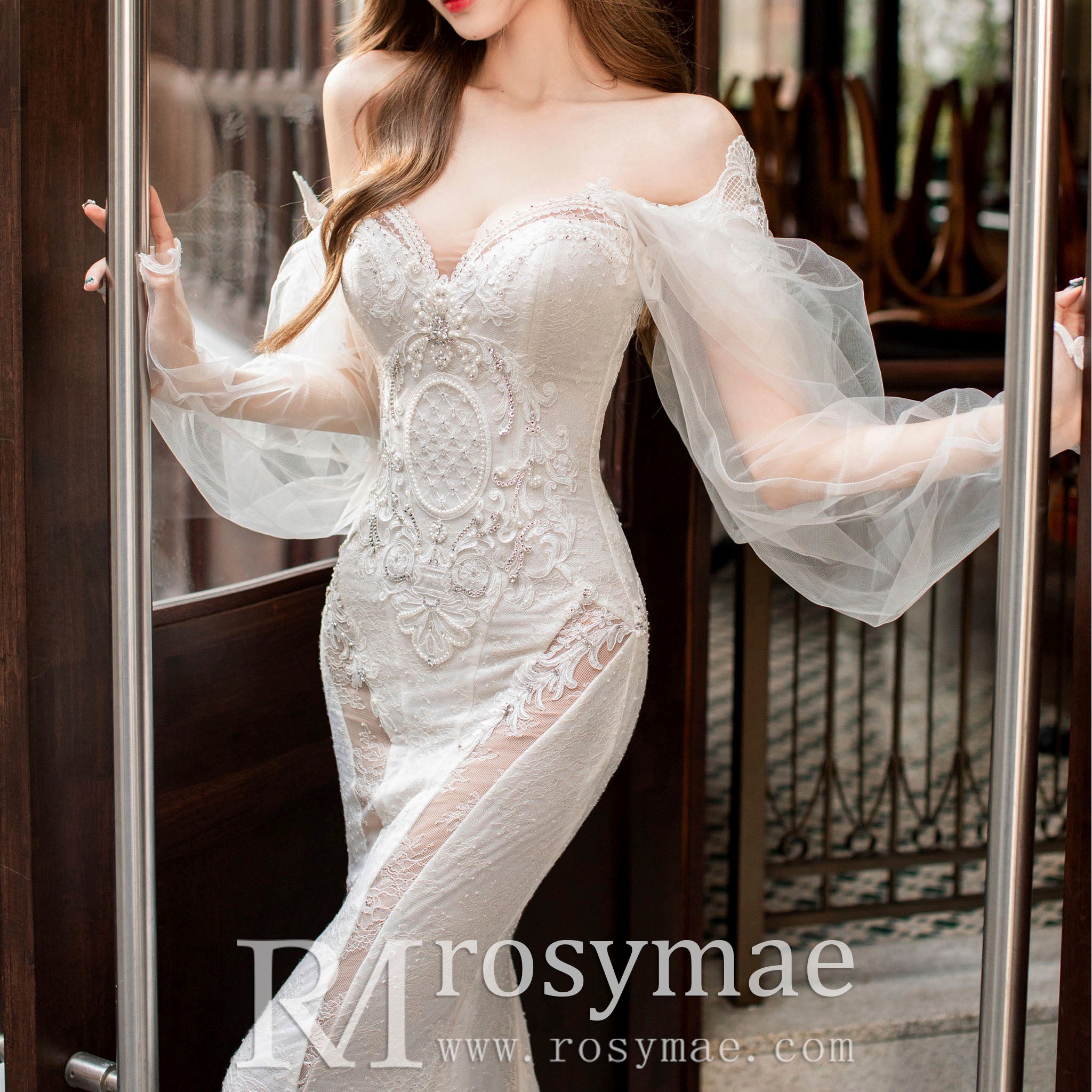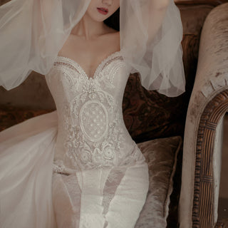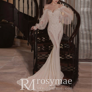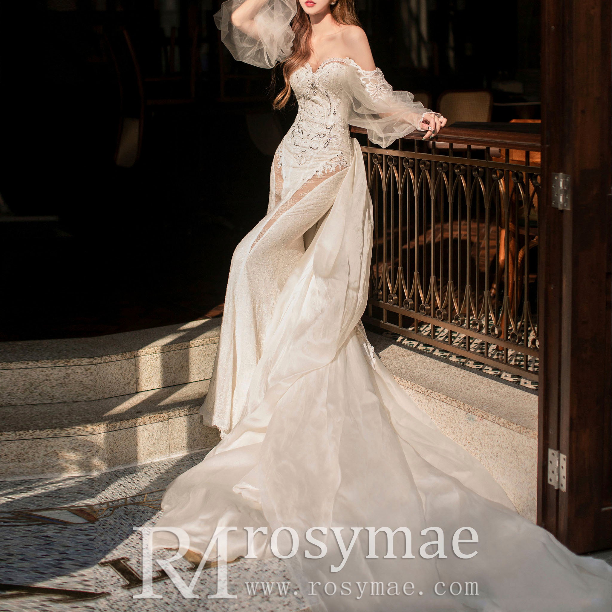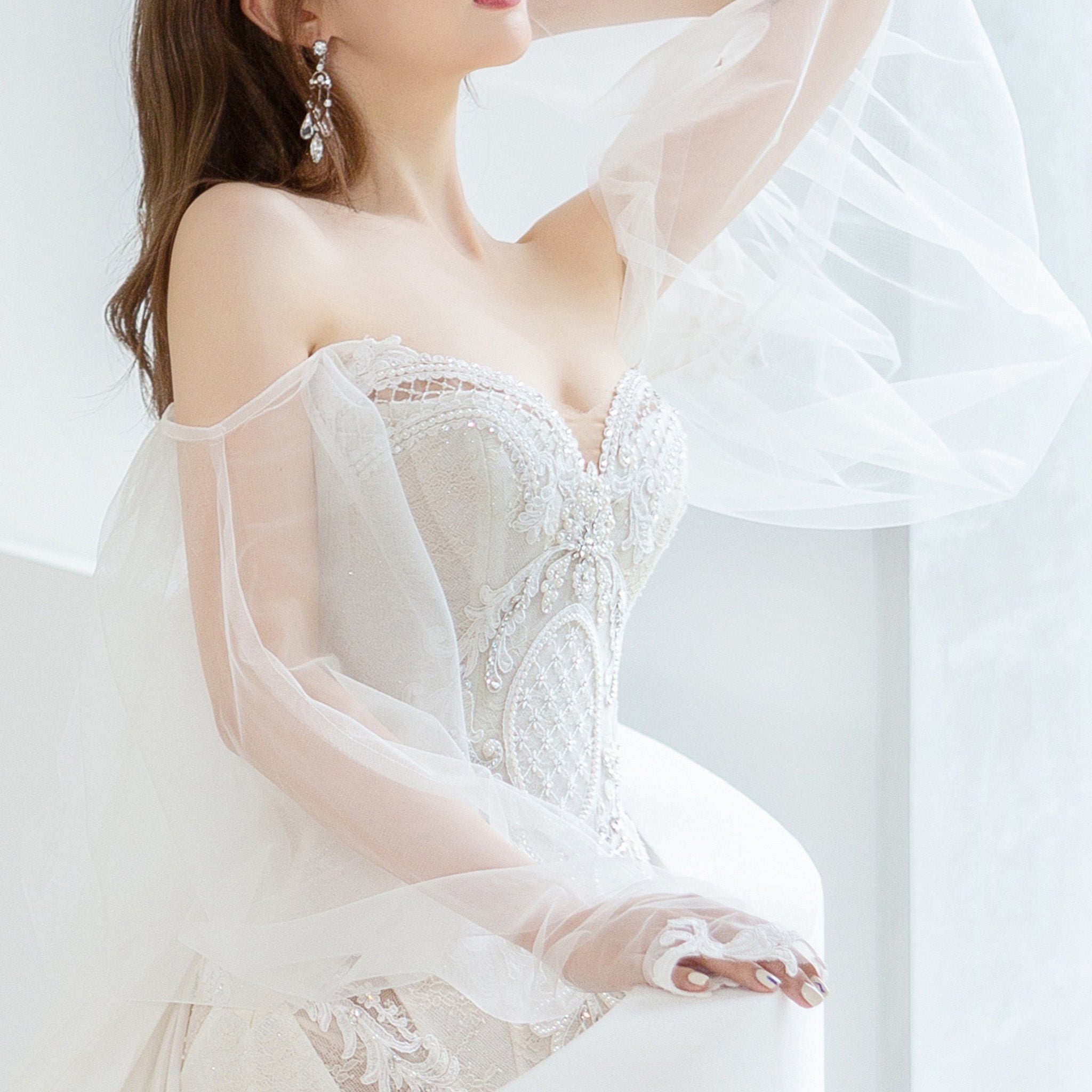Turn heads with this on-trend mermaid bridal gown that combines contemporary style with timeless elegance. The distinctive lantern sleeves create a fashion-forward silhouette that sets you apart while providing graceful, flattering coverage. Delicate pearls are strategically placed throughout the gown, catching light beautifully and creating a luminous sparkle that photographs absolutely stunning. The fitted mermaid silhouette hugs your curves in all the right places before flowing into an elegant fishtail, creating a silhouette that celebrates your natural beauty and commands attention. The sheer skirt detailing adds an ethereal quality and romantic touch, balancing the gown's modern elements with timeless femininity. What truly elevates this dress is the ingenious detachable train—offering you complete flexibility to transition from a dramatic ceremony entrance to an elegant reception where you can move freely and celebrate without restriction. This is the ultimate choice for the fashion-conscious bride who wants to stay ahead of trends without sacrificing sophistication. Perfect for the modern woman who refuses to blend in—a gown that celebrates your individuality, style, and the magic of your special day with undeniable presence and unforgettable allure.