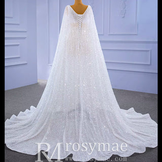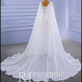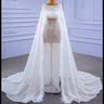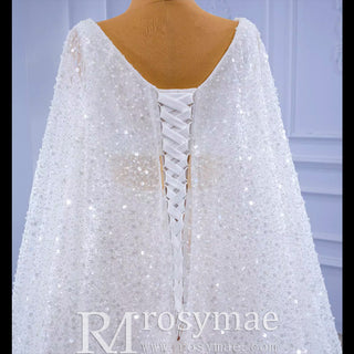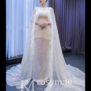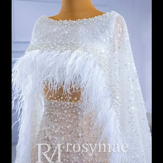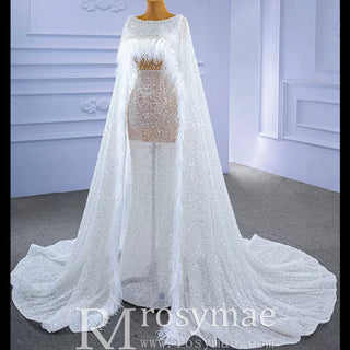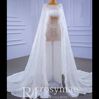 Step into a world of contemporary luxury with this exquisite handmade wedding dress, where minimalist elegance meets dramatic flair. The sleek sheath silhouette gracefully skims your figure, while the delicate sheer fabric creates an ethereal, modern aesthetic. The stunning beaded cape sleeve flows from the shoulders in a cascade of sparkling crystals and pearls, adorned with whimsical feather accents that add movement and artistic dimension to your walk down the aisle.
