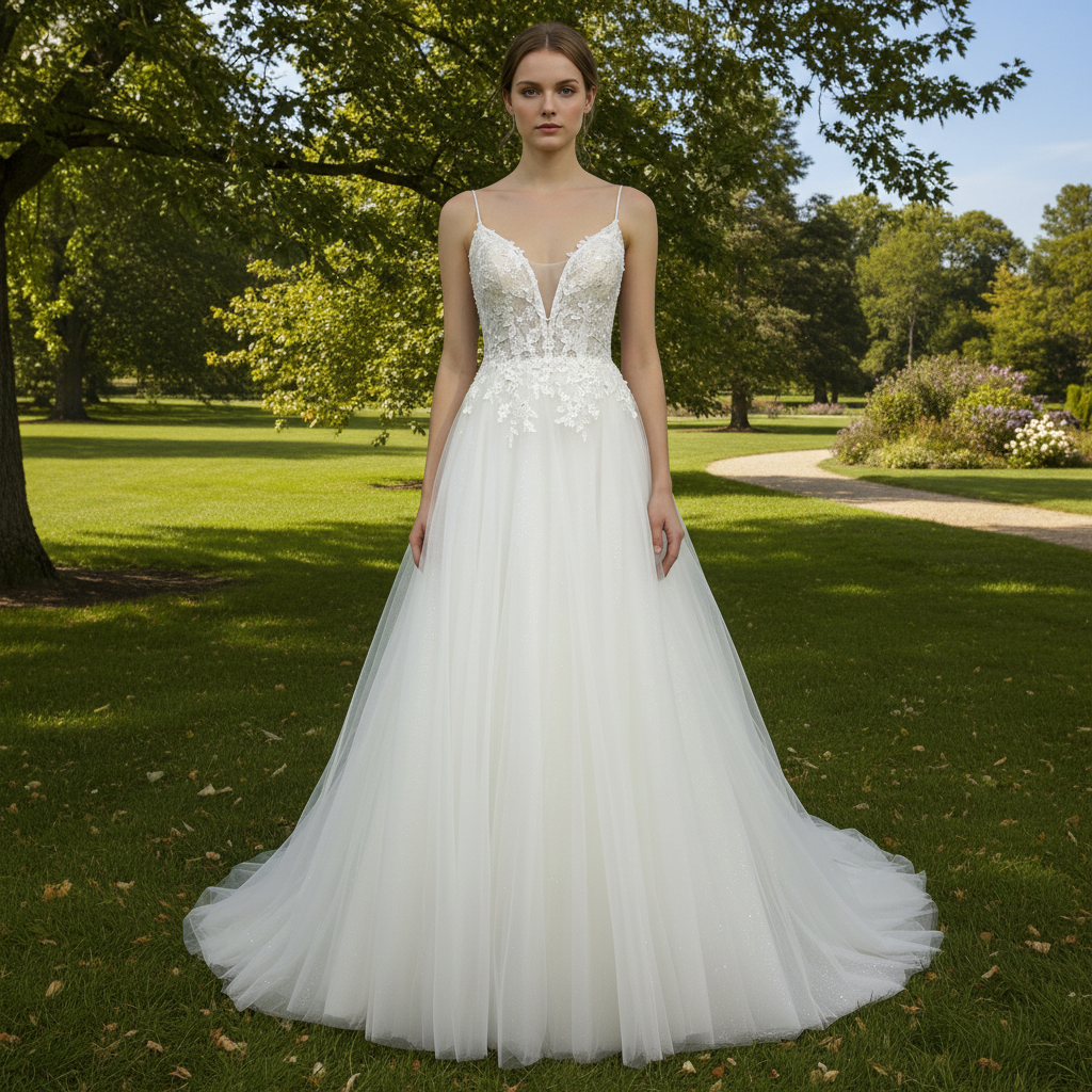 A Line Bling Tulle V Neck Wedding Dresses with Spaghetti Straps