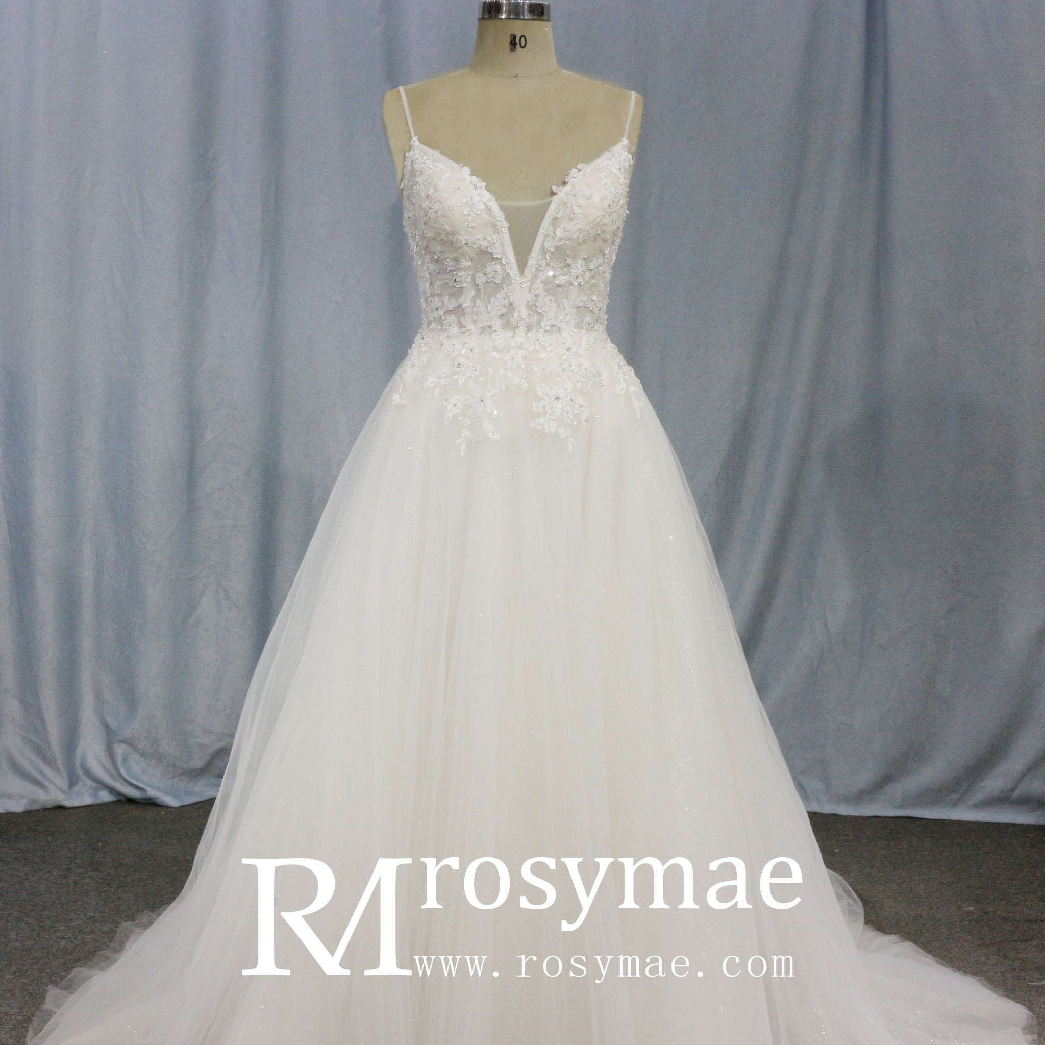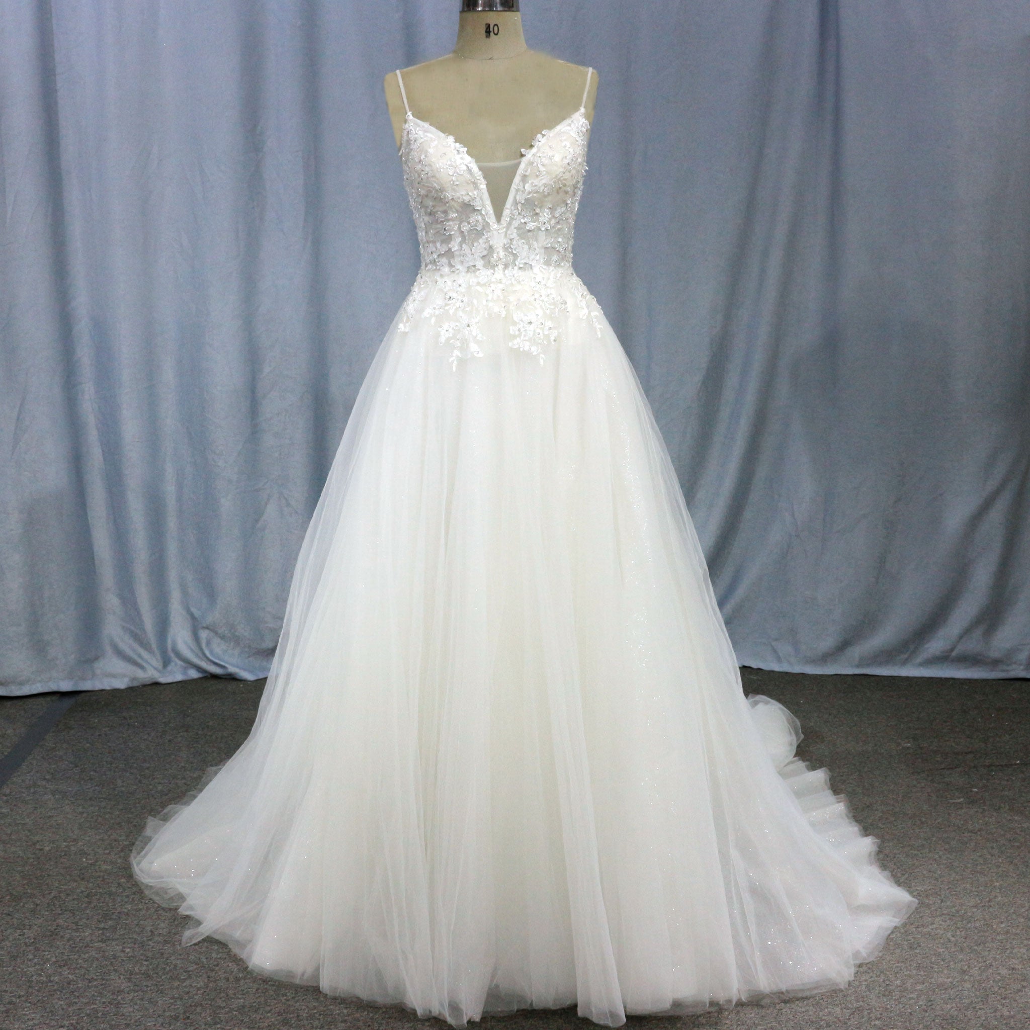 Perfect wedding dress with spaghetti straps with sexy plunging v neckline, lace appliqued top beaded crystals, corset back with brush train.