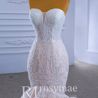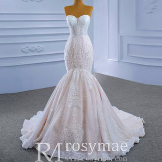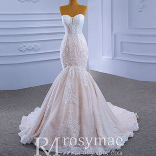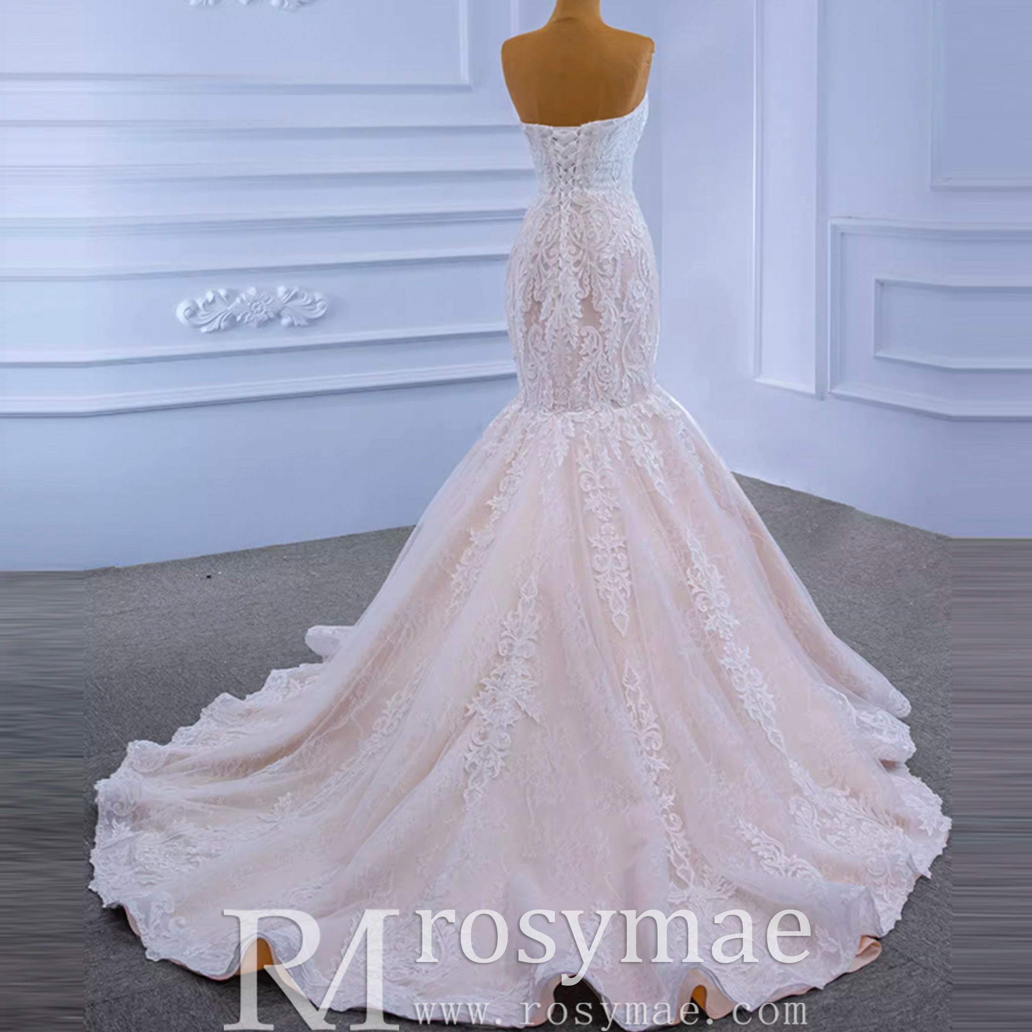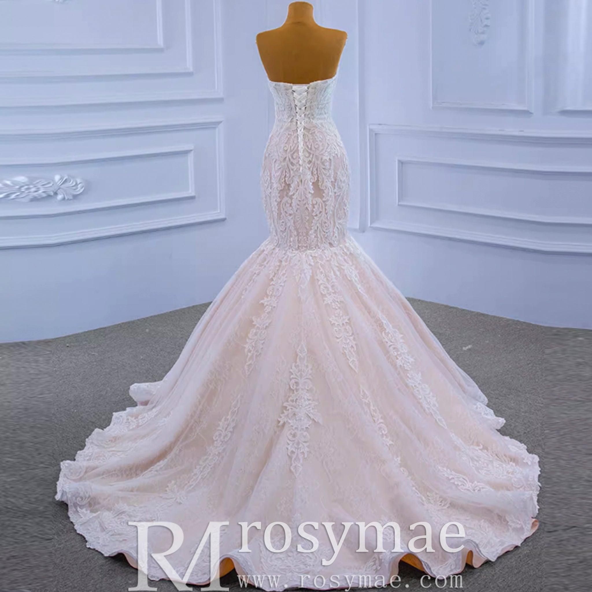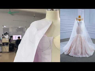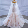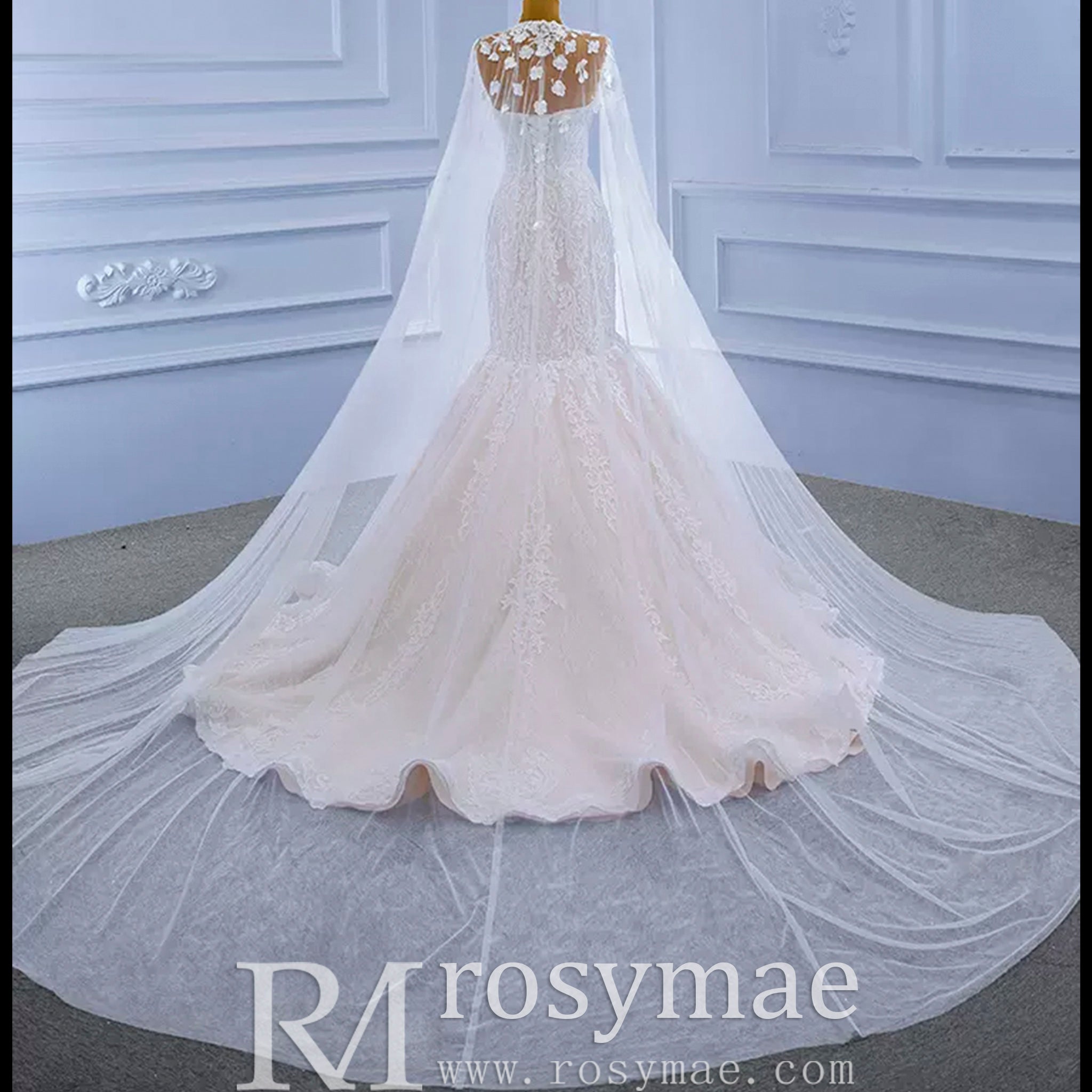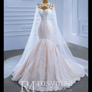 Step into a fairytale with this exquisite handmade wedding dress, where vintage charm meets modern luxury. The delicate blush-pink hue creates a soft, romantic glow that complements your natural beauty, while the elegant high neck cape adds a touch of dramatic sophistication. Intricate lace appliqués cascade across the fitted mermaid silhouette, creating a mesmerizing tapestry of floral patterns that dance with your every movement.