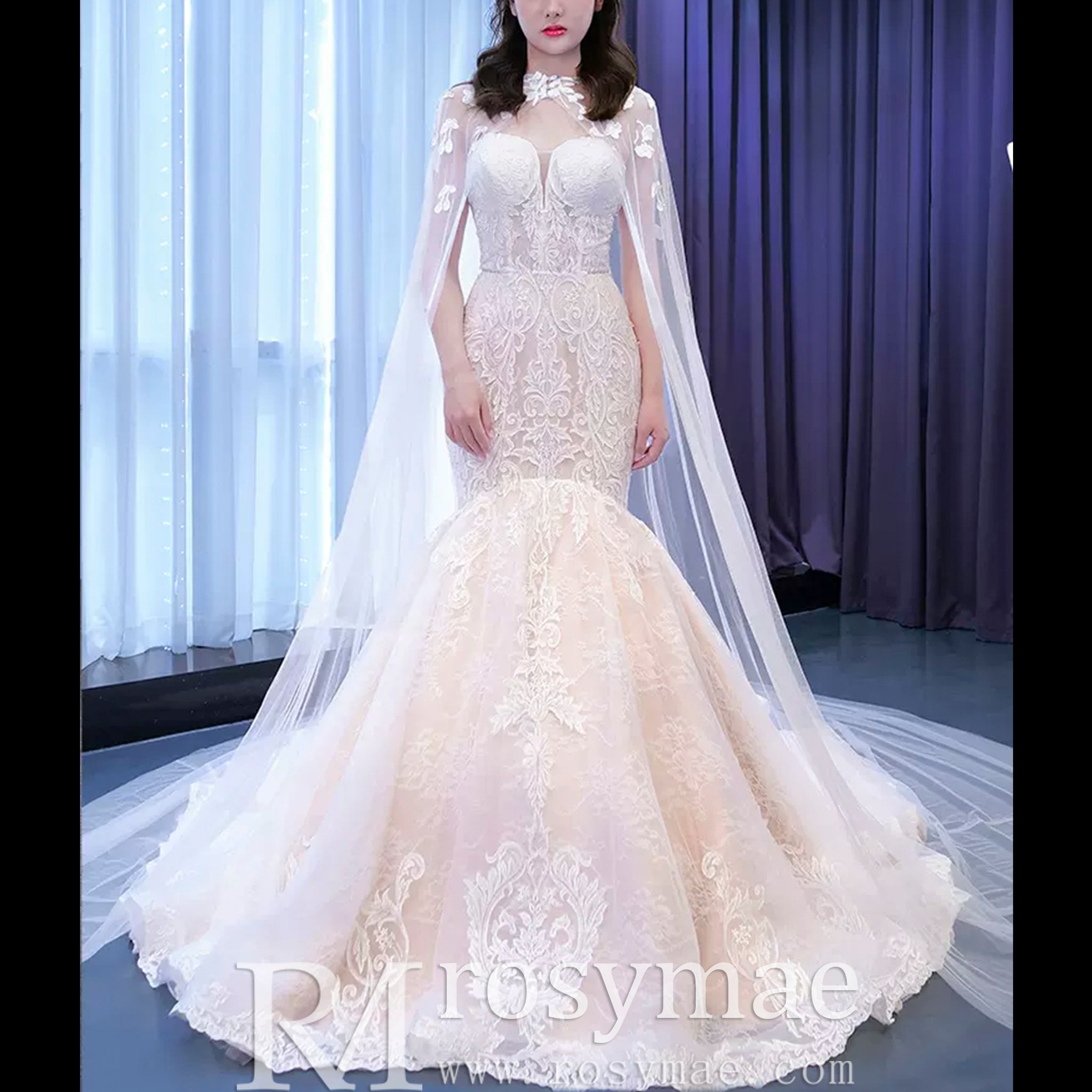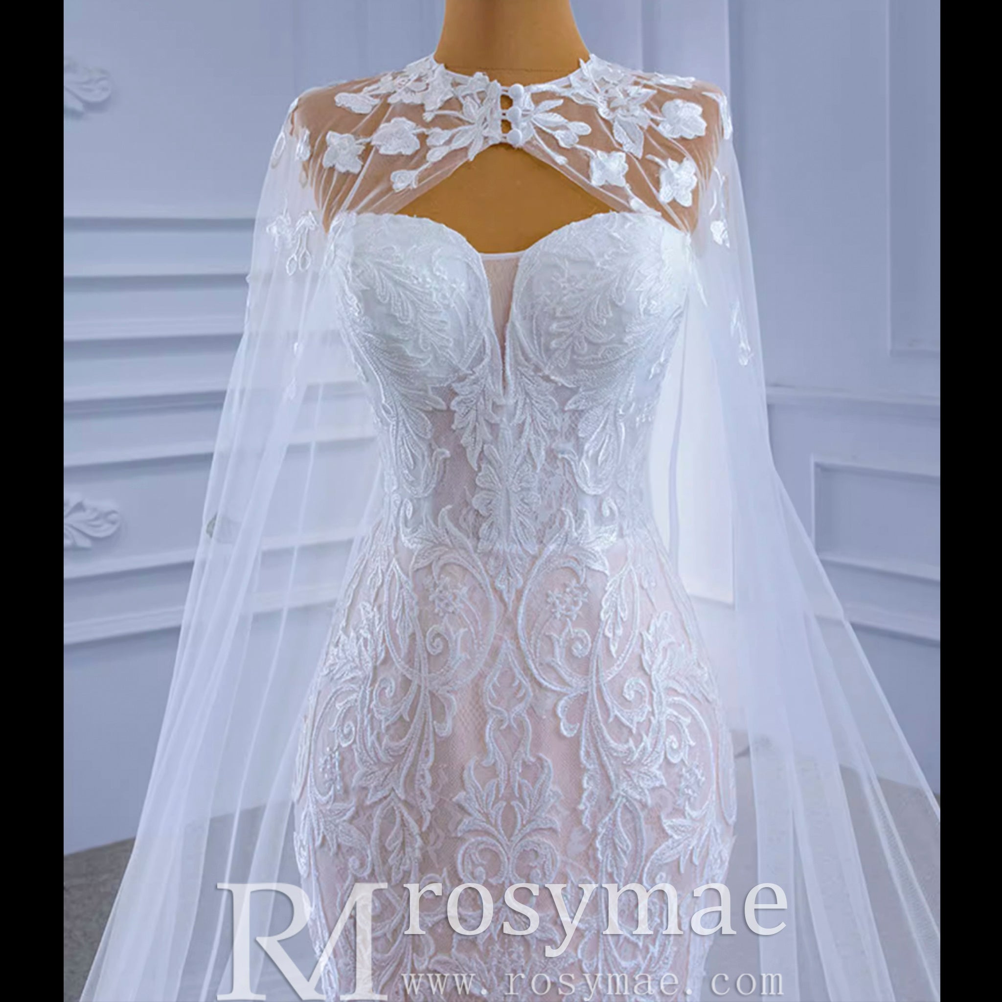 Vintage Mermaid Lace Wedding Dress with High Neck Cape