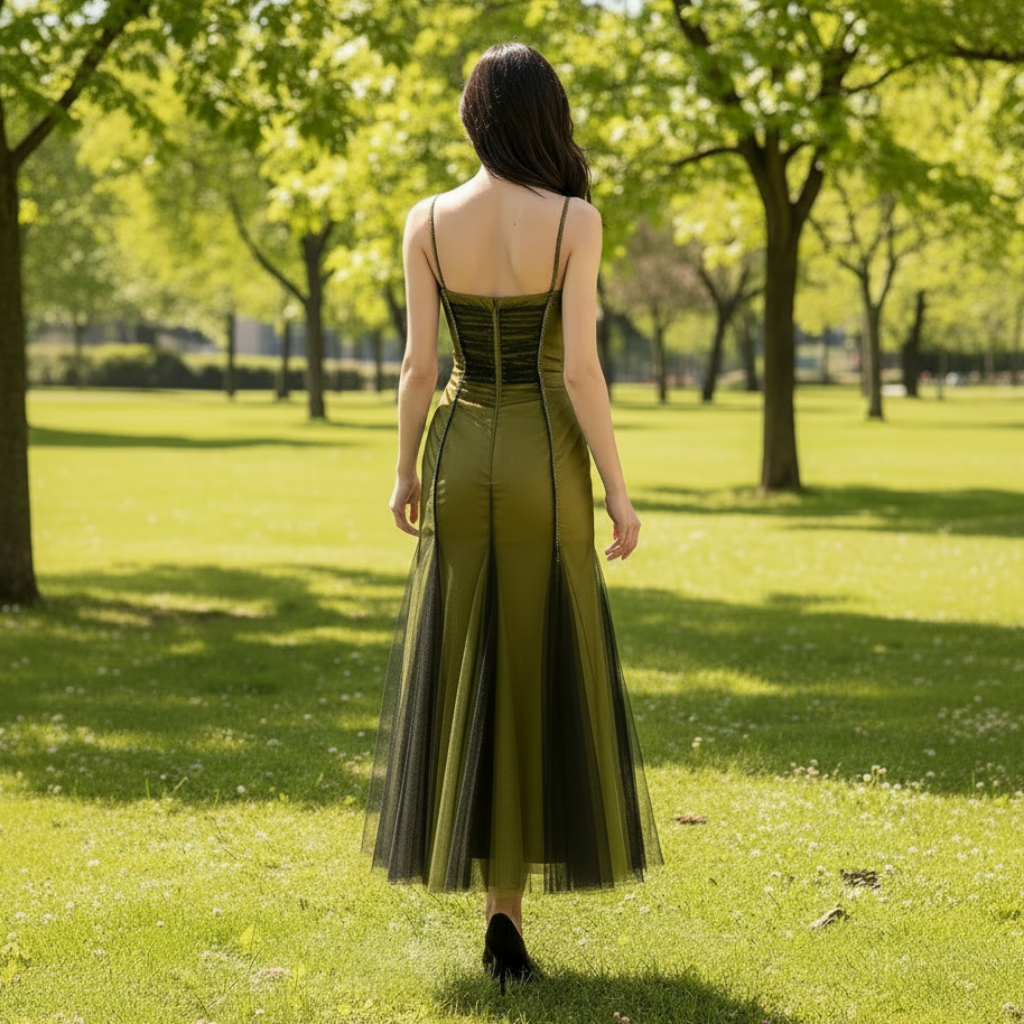 Caress the contours of your silhouette in this stunning dark green under knee-length cocktail dress with spaghetti straps. Featuring a sweetheart neckline and flattering calf-length midi fit, you'll be sure to turn heads.