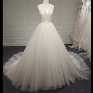 The slender strap option for a wedding dress is an ideal pick for brides looking for a subtle and simplistic appearance. The straps offer a subtle and elegant support, ensuring comfort and confidence on your special day.